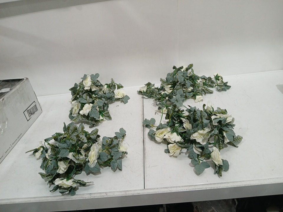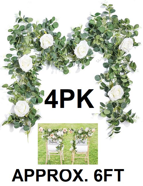 4PK ARTIFICIAL EUCALYPTUS GARLAND WITH WHITE ROSES - APPROXIMATELY 6 FEET - WHITE/GREEN