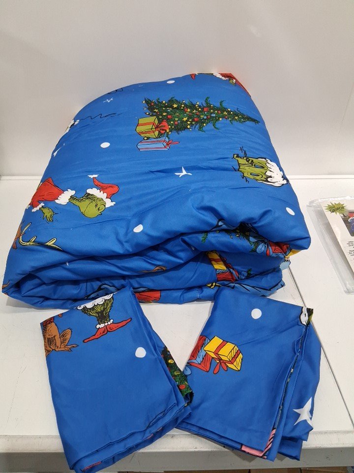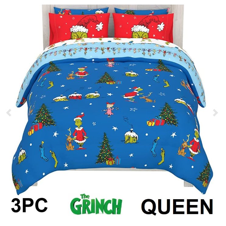 3pc the grinch by dr. seuss bed set - reversable comforter, 2 pillow shams- size queen - multi colour (model:6c6968)