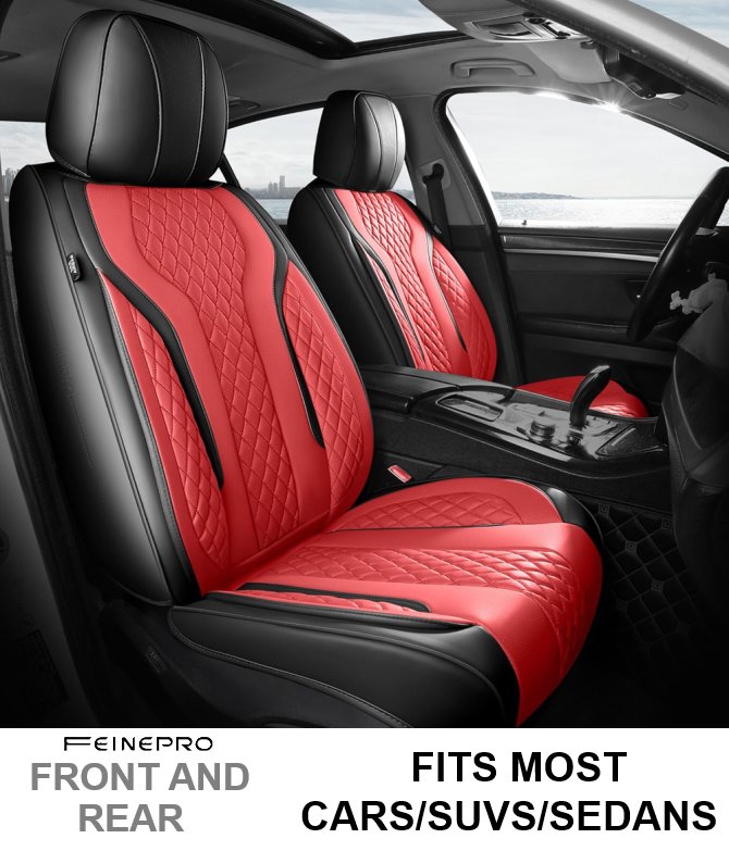 FEINEPRO FUAX Leather Car Seat Covers Full Set FRONT AND REAR - FITS MOST Cars, SUV AND SedanS - BLACK RED