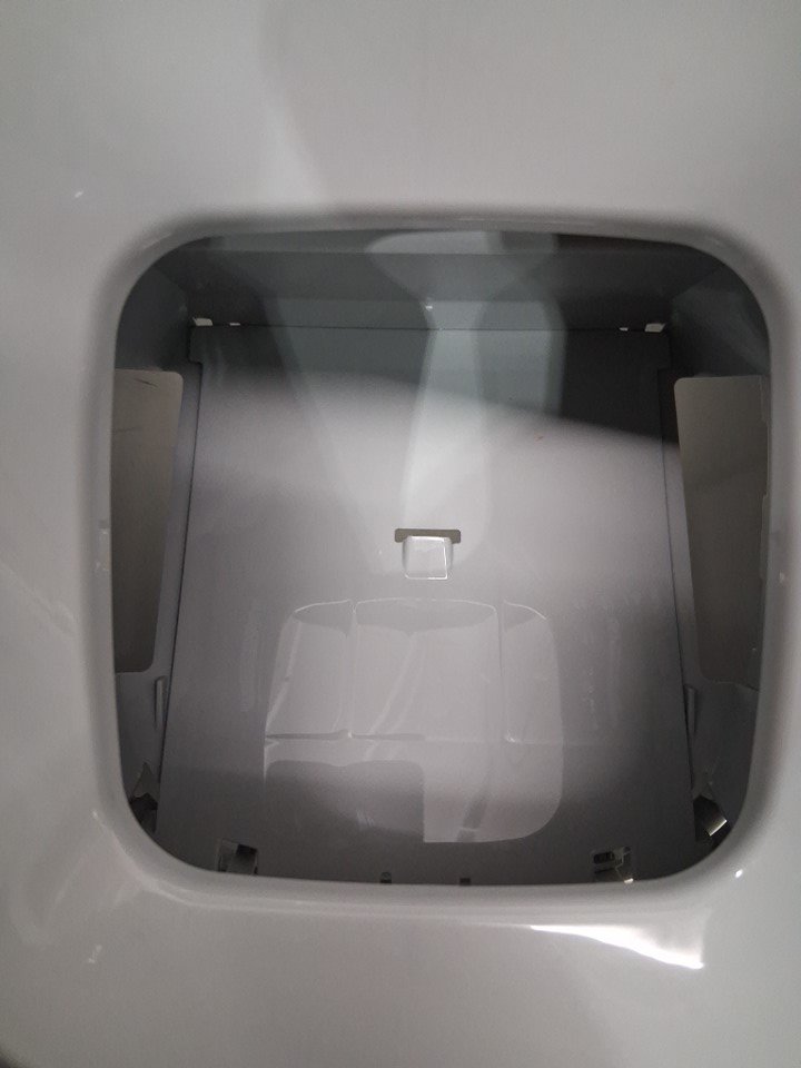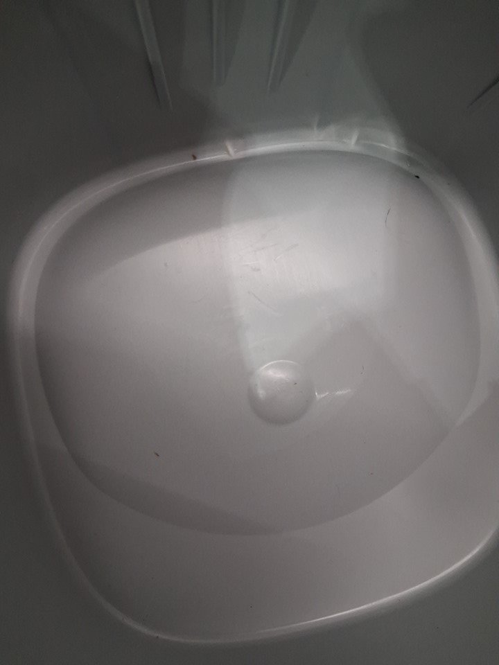 There are a couple scratches/scuff marks on the litter pail from previous use, there is also a little bit of cat hair on the pail.
