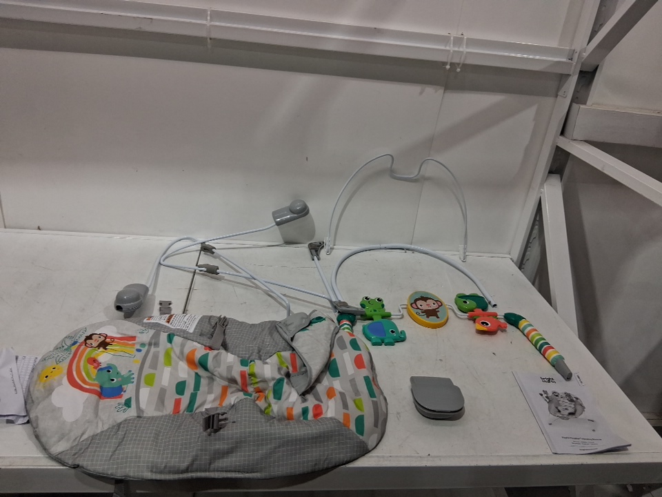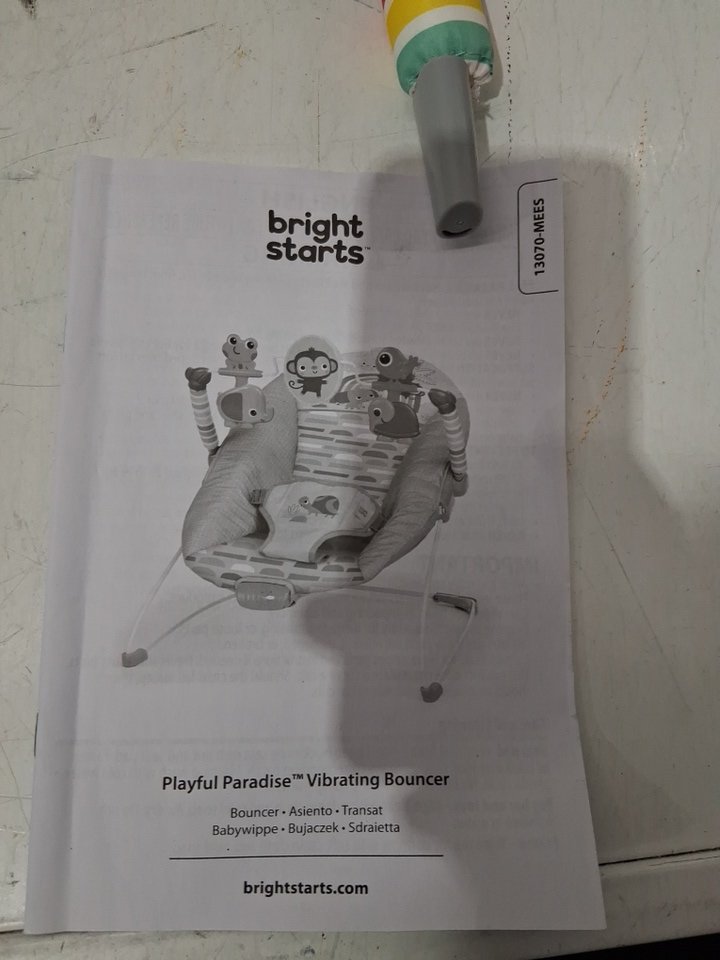 BRIGHT STARTS PLAYFUL PARADISE COMFY PORTABLE 3-POINT HARNESS VIBRATING BOUNCER WITH TOY-BAR - MULTICOLOUR (MODEL:‎13070 )