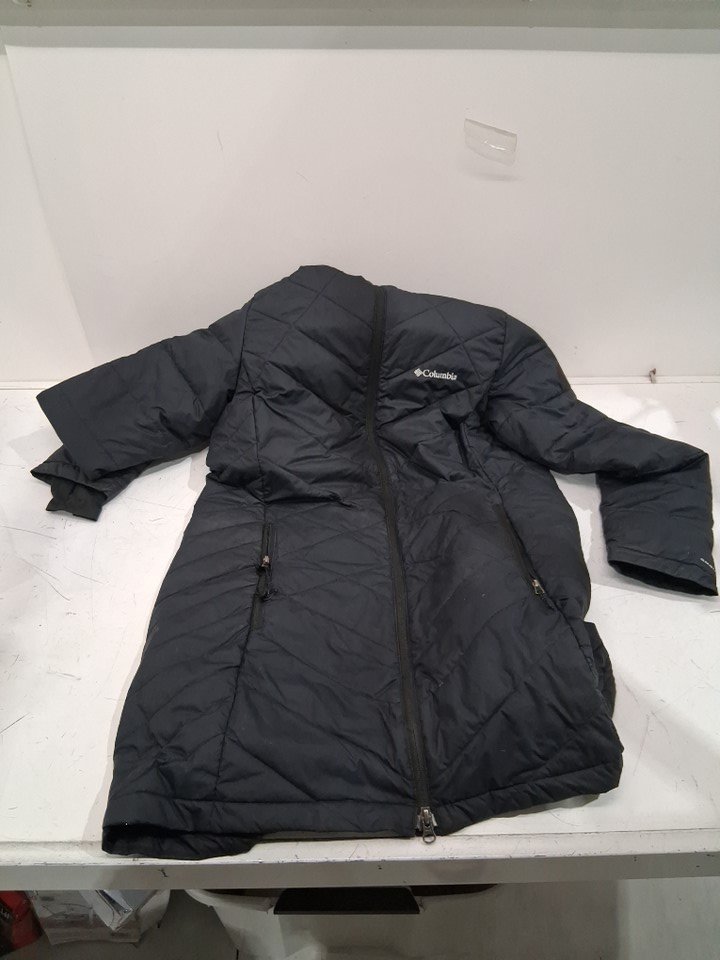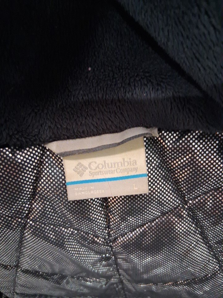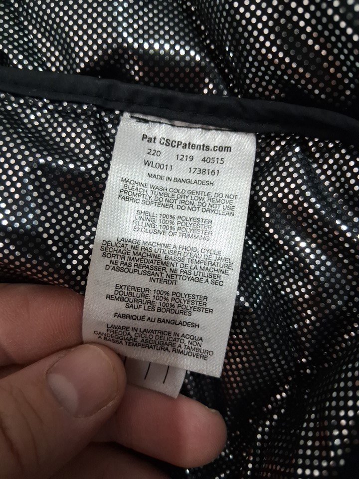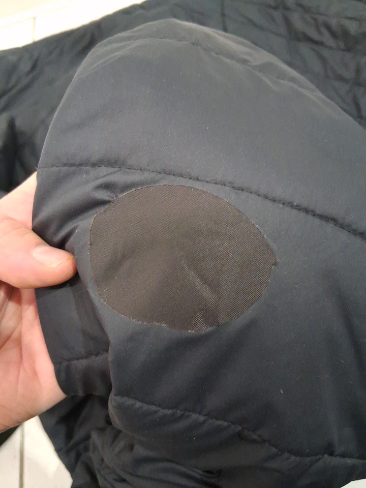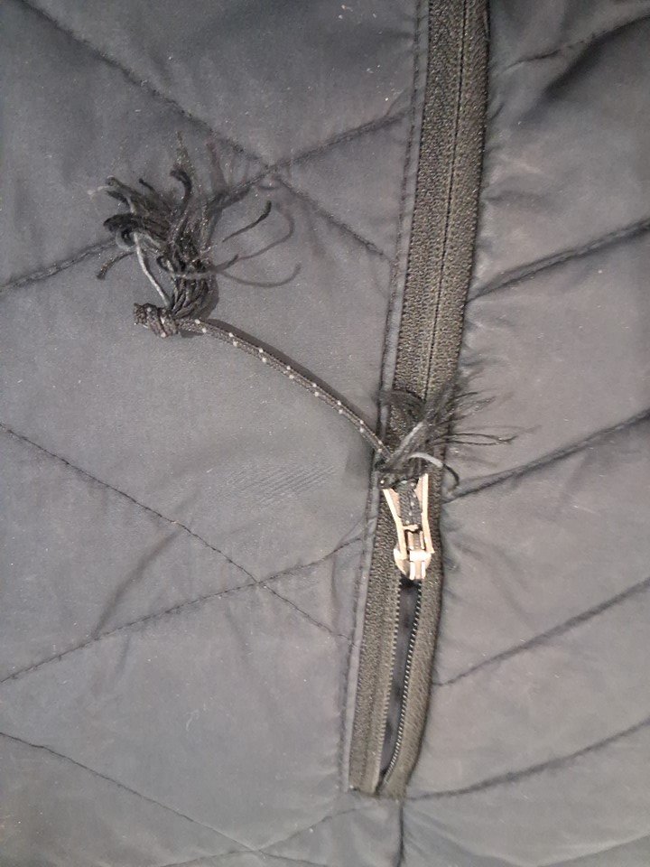 There is some noticeable staining from previous use present on the front and backside of the garment. Product once had a hole that seems to have been patched by previous owner. A zipper is frayed and damaged on the garment as well.