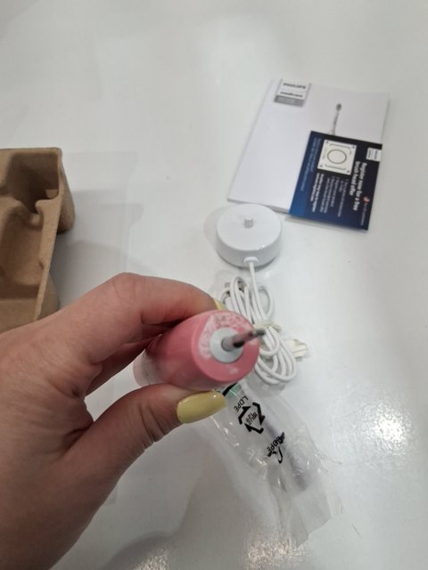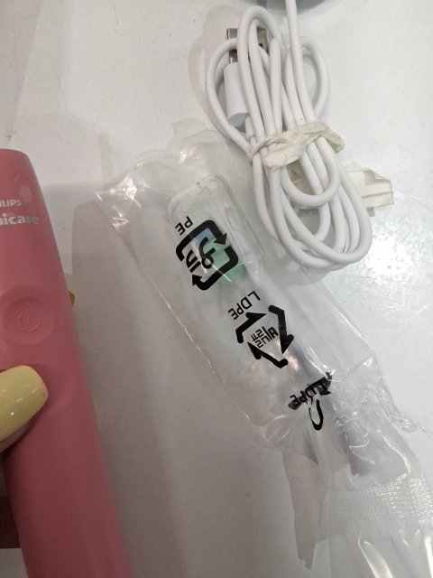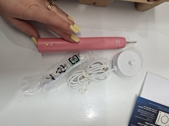 There is a bit of toothpaste residue on the brush handle and one of the included brush heads came opened. We recommend doing a personal clean of this item before use.