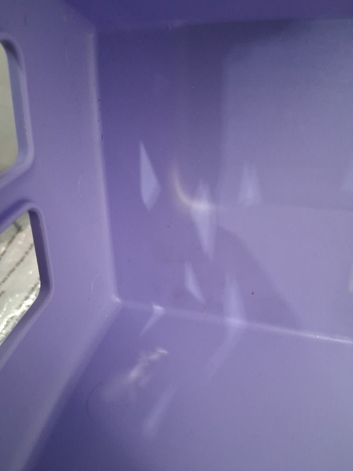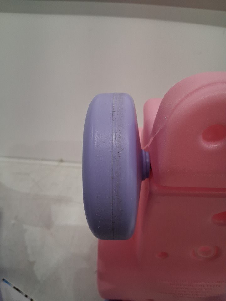 There are some small scuff marks in the shopping cart part of the car, and the wheels also show light signs of use.