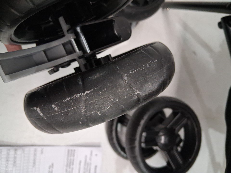Products wheels are slightly worn, and the seat has some small crumbs (See photos)