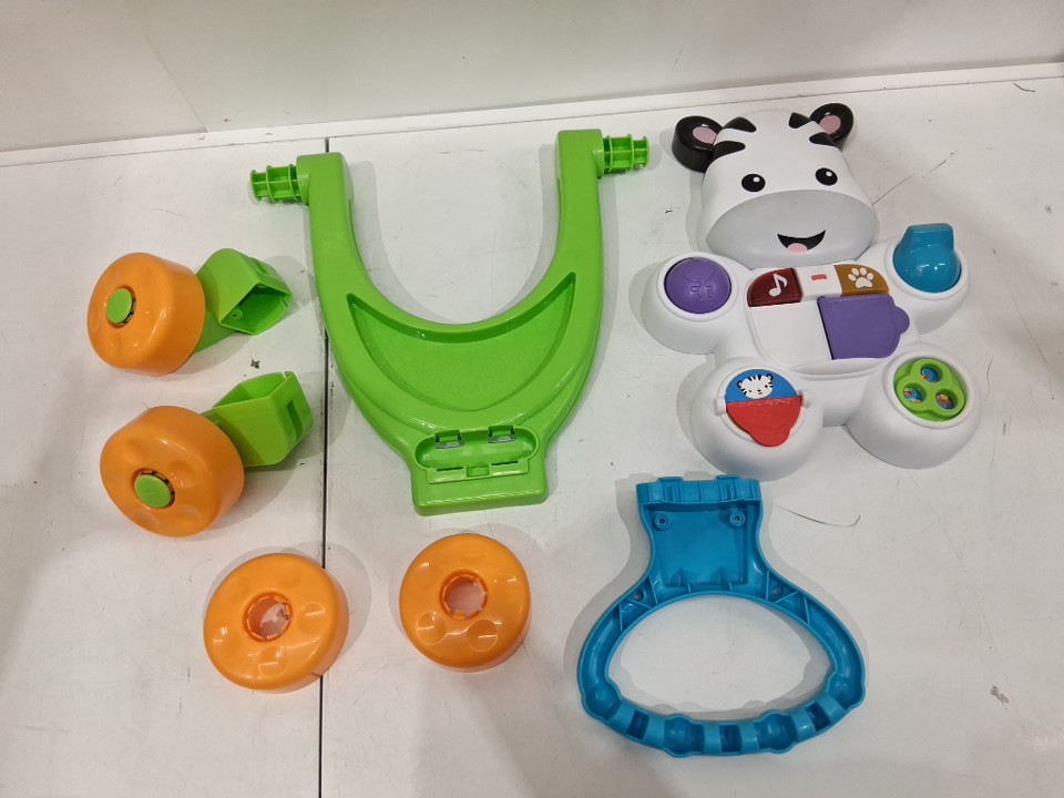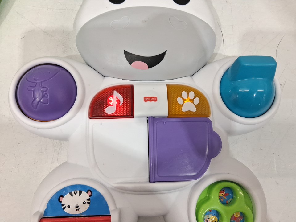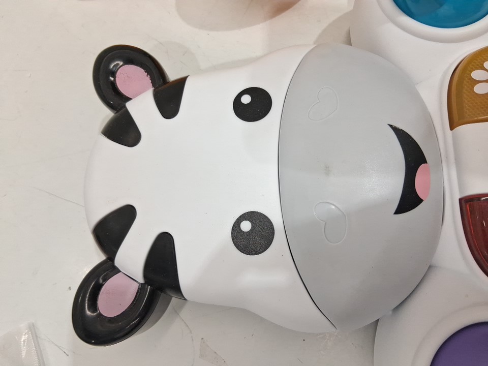 Item shows signs of previous use such as mild scuffs/makings on surface and some of the painted areas are faded or rubbed off. Item has white residue on back of main portion by battery pack. Item is missing stickers such as hearts on the nose, and numbers on the plastic flippers on body. Item tested for power.