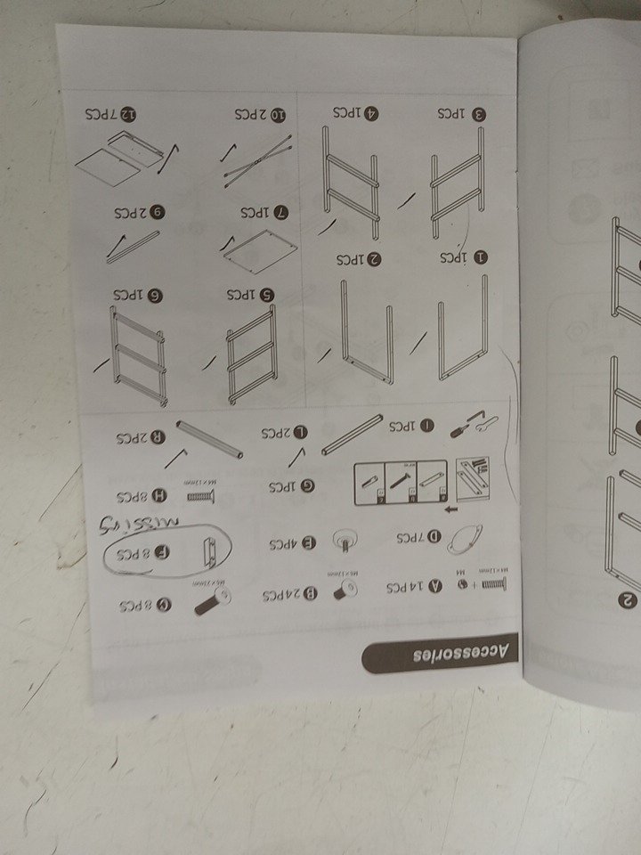 Missing "f" piece hardware and migth be smising some screws Generic condition statement: *GENERIC CONDITION STATEMENT* This item has been handled/inspected, tested if needed by our listing staff to the best of their ability/knowledge and for an unknown reason arrived to our facility with an issue. This issue can either be a very minor/major cosmetic issue which most likely occurred during shipping such as a dent, indent, scuff, stain, scratch or knick. If not a cosmetic issue, it can be a function issue with the item itself or there could be certain parts missing to make the item complete from how it is sold originally. (See lister notes and photos attached of the issue stated as well as packaging condition)