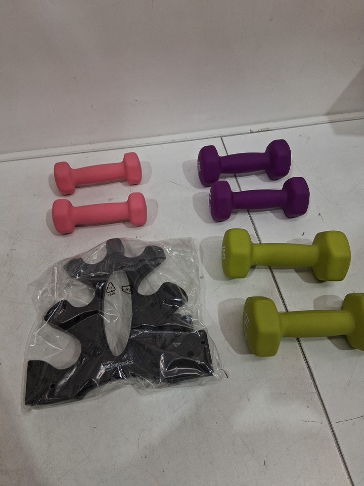 3PR Amazon Basics Neoprene Dumbbell Hand Weights With Rack - 2lbs/3lbs/5lbs - pink/purple/greenish yellow - (Model: B0727Q5F94)
