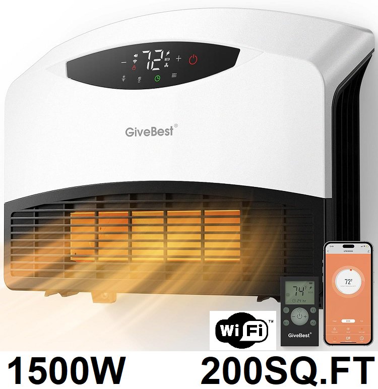 givebest electric wall-mount space heater with remote & app controls - 1500w 200sq.ft - white (model: uph310m)
