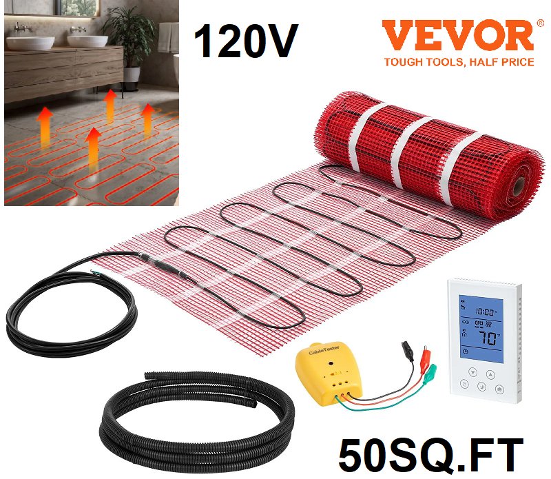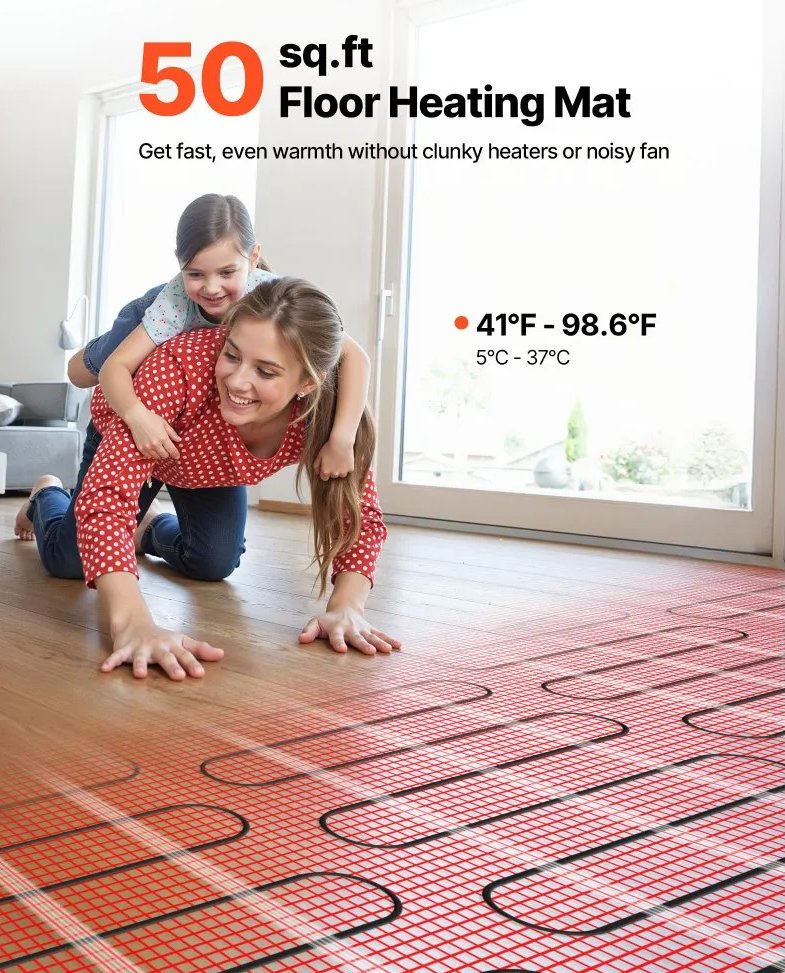 vevor self-adhesive mesh floor heating system - 120v - 50sq.ft coverage - red (model: shhm-600)