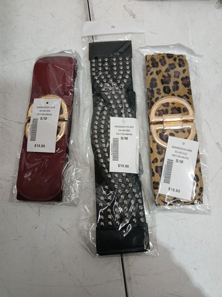 3PK WOMEN'S CLEO D-Buckle AND STUDDED Stretch BeltS - SMALL/MEDIUM- BLACK BURGUNDY LEOPARD