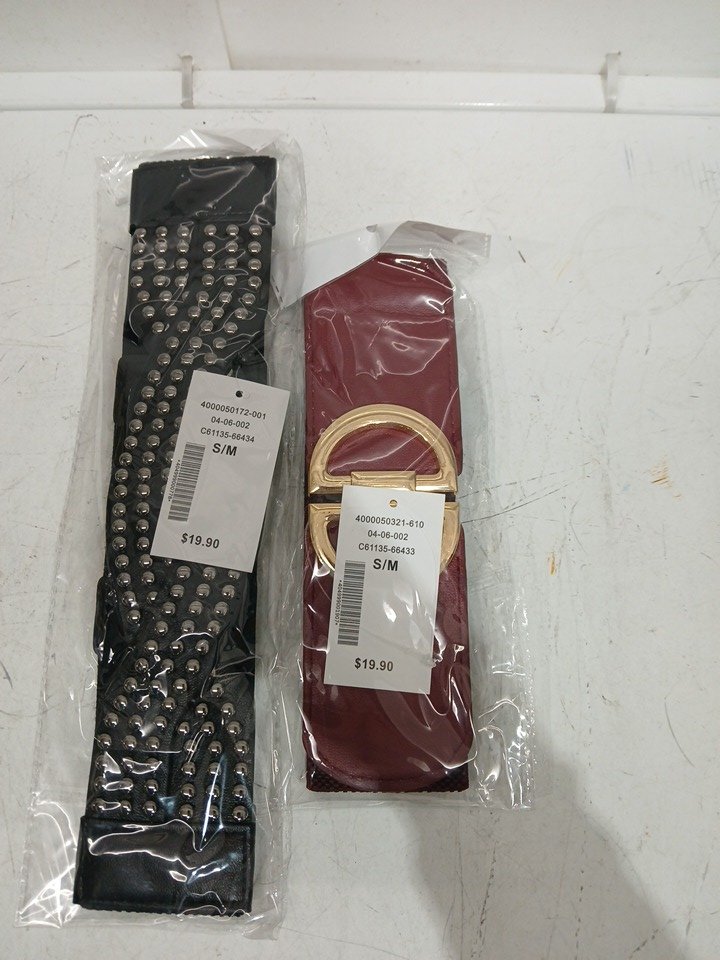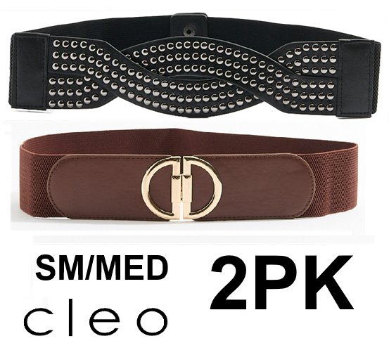 2PK WOMEN'S CLEO D-Buckle AND STUDDED Stretch BeltS - SMALL/MEDIUM- BLACK BURGUNDY