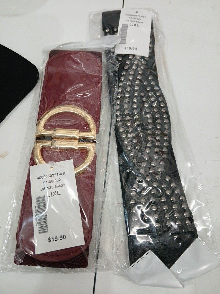 2PK WOMEN'S CLEO D-Buckle AND STUDDED Stretch BeltS - LARGE/EXTRA LARGE - BLACK BURGUNDY