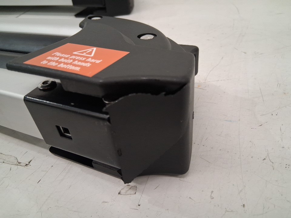 One rack has brace broken off screws; clasp cover has partial crack. (See photos)