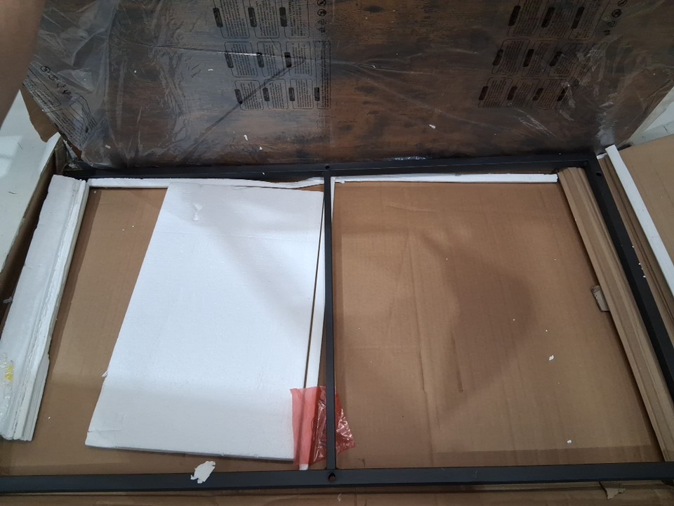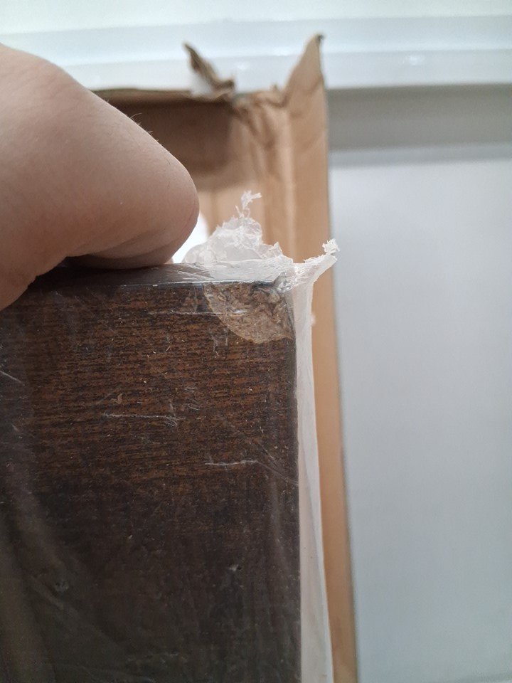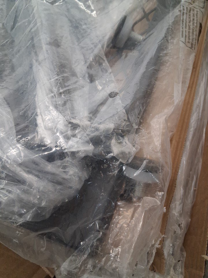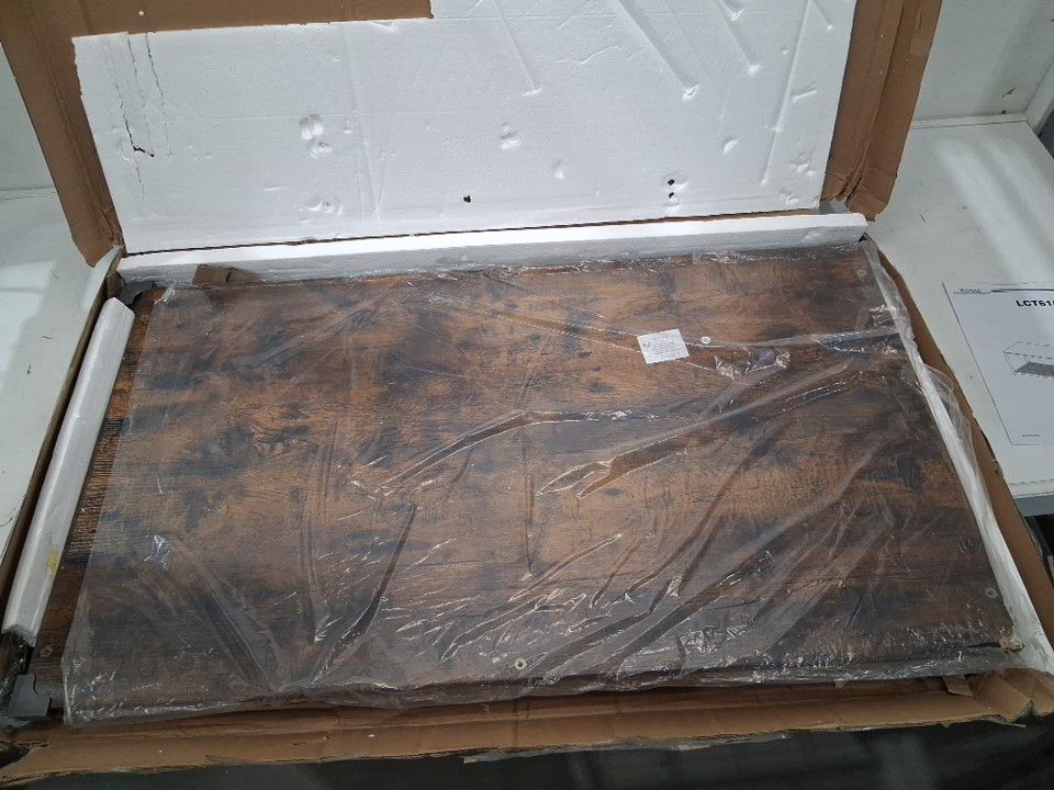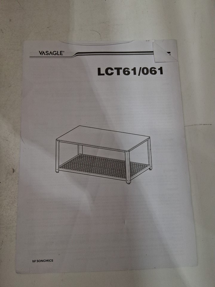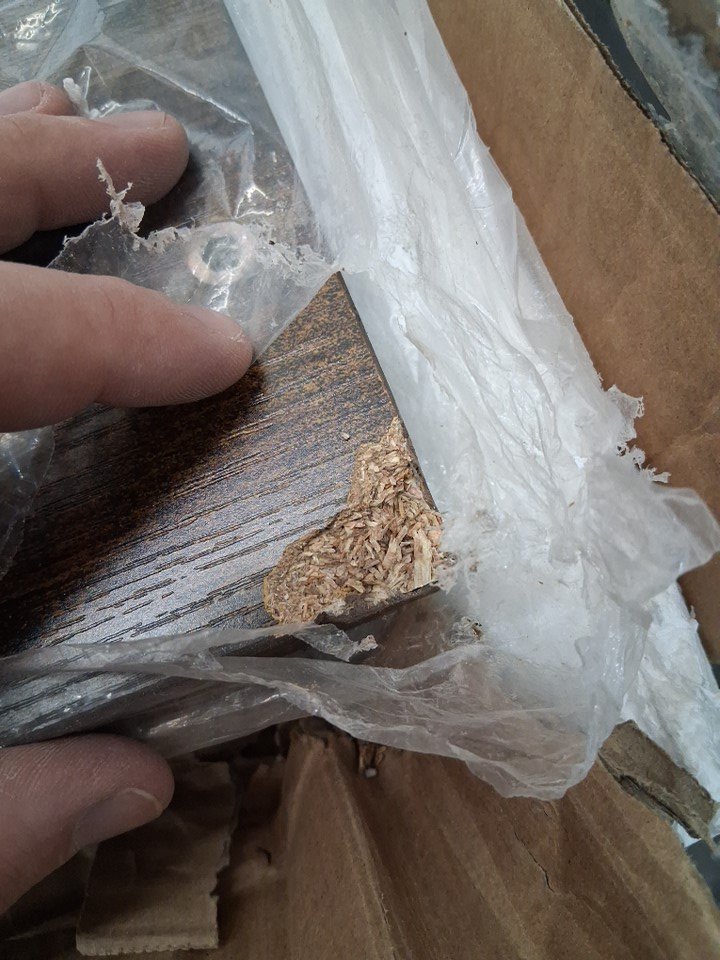One corner of the wood tabletop is chipped on both the top and underside due to shipping, but this appears to be only a cosmetic blemish and should not affect the structural integrity or use of the table in any way - see photos. Customer may also need to provide some extra hardware themselves (screws, etc.) in order to finish assembly, as some hardware was loose in the box when opened and may have gone missing during shipping.