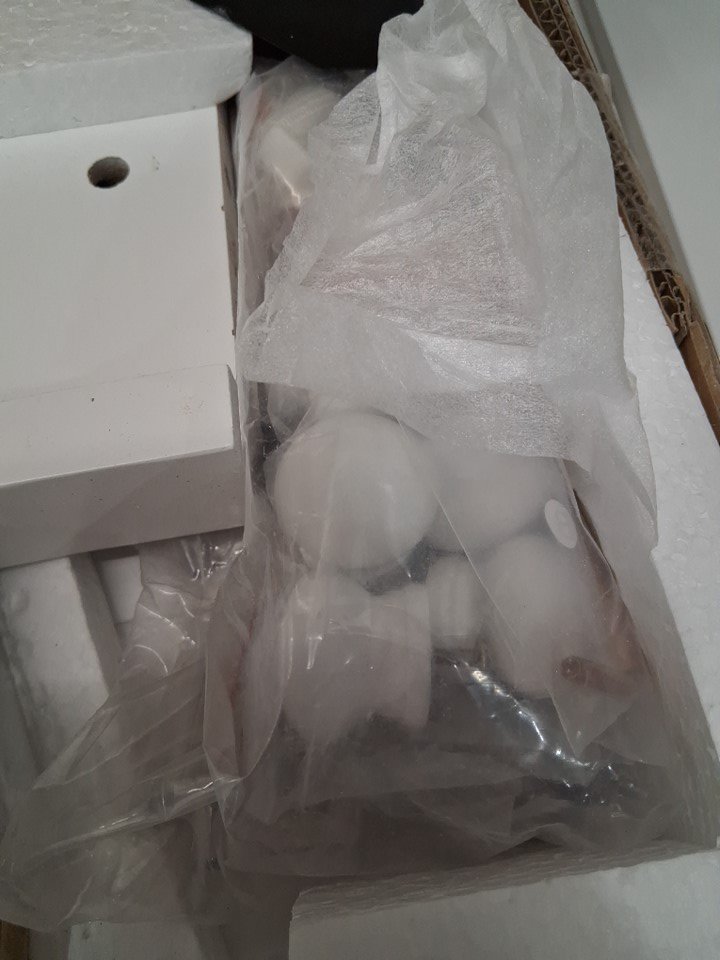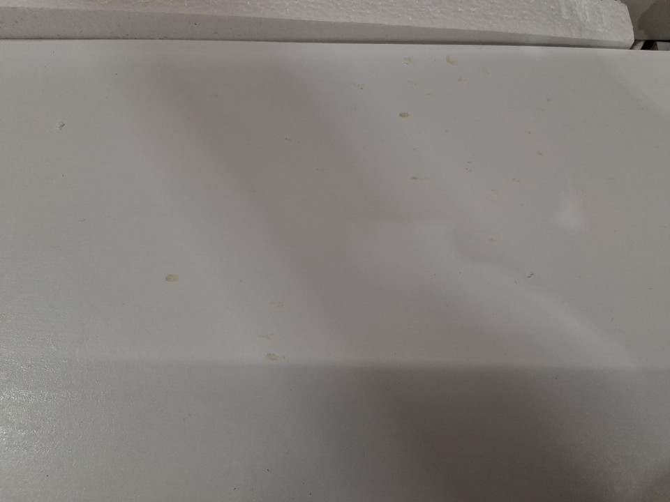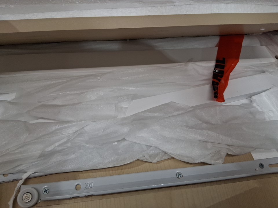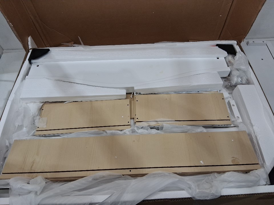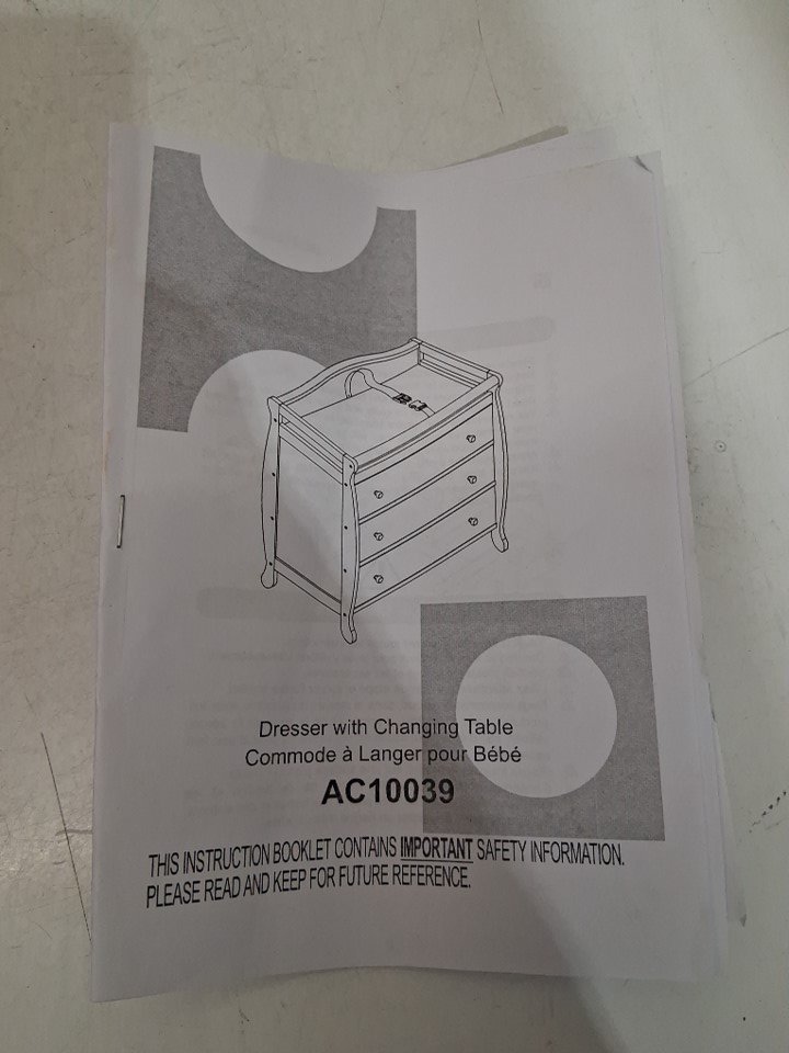 There are some light stains on the front of one drawer and on the curved top of the changing table, but this is likely the result of a mishap during manufacturing or handling as no parts show any signs of having been previously assembled or used, and all hardware is still in the original packaging - see photos. Outside of the stains, which should be fairly easy to clean, all parts appear to be present and in new condition.