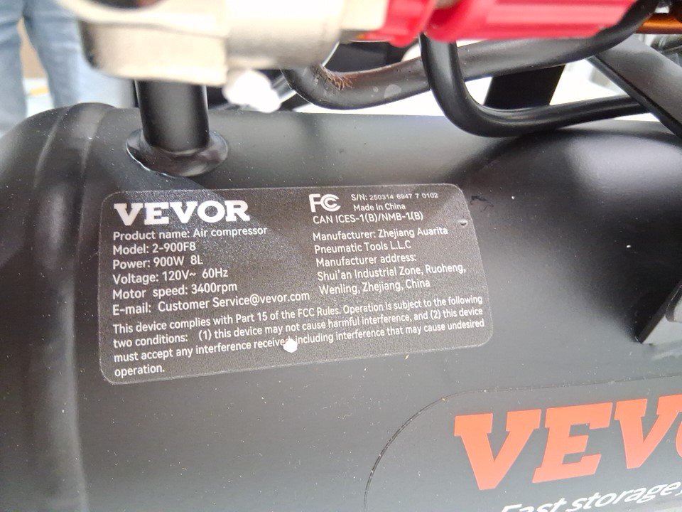 Vevor oil free air compressor - 8L - 900W - 120V - psi 90 - black/orange (model: 2-900f8)