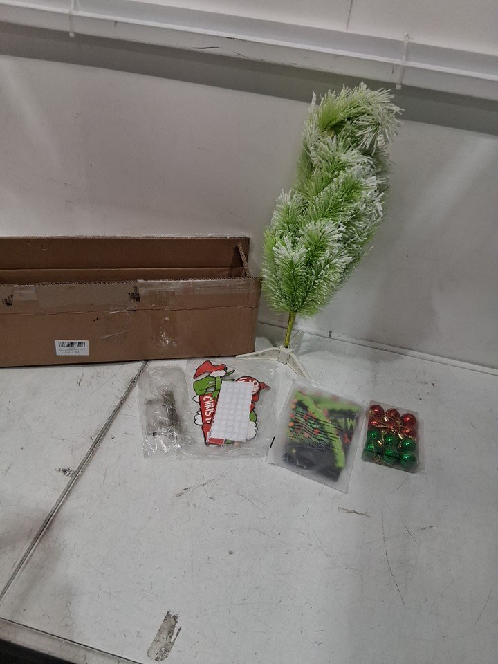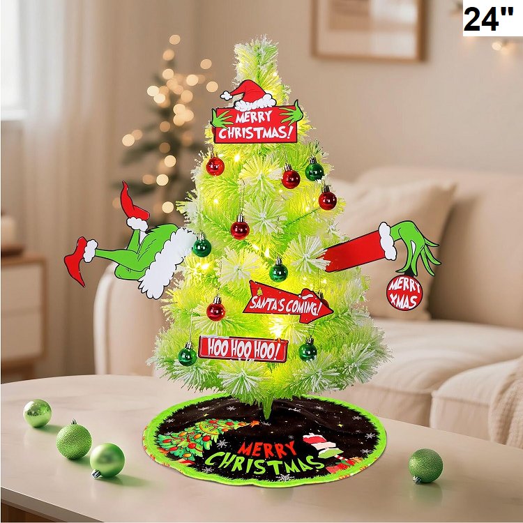 Odewhine Grinchs Christmas Tree Snow Flocked Pine Tree with Ornaments, Tree Skirt & Card Decor, Mini Xmas Tabletop Tree - 24" - green
