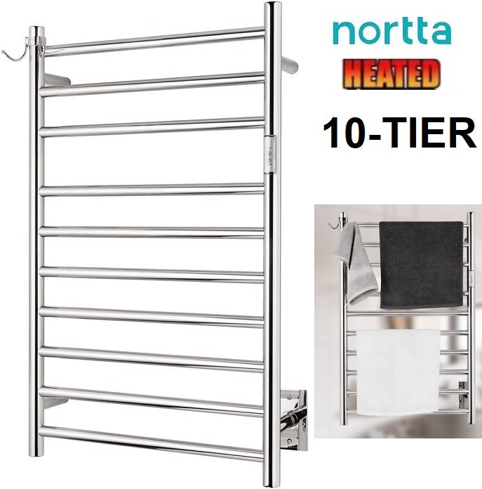 NORTTA Wall Mounted Towel Warmer with Plug-in and Hardwired Options 3 Working Modes - 10-TIERS - 21" X 34" - BRUSHED Stainless Steel - (model:A-CR10MN)