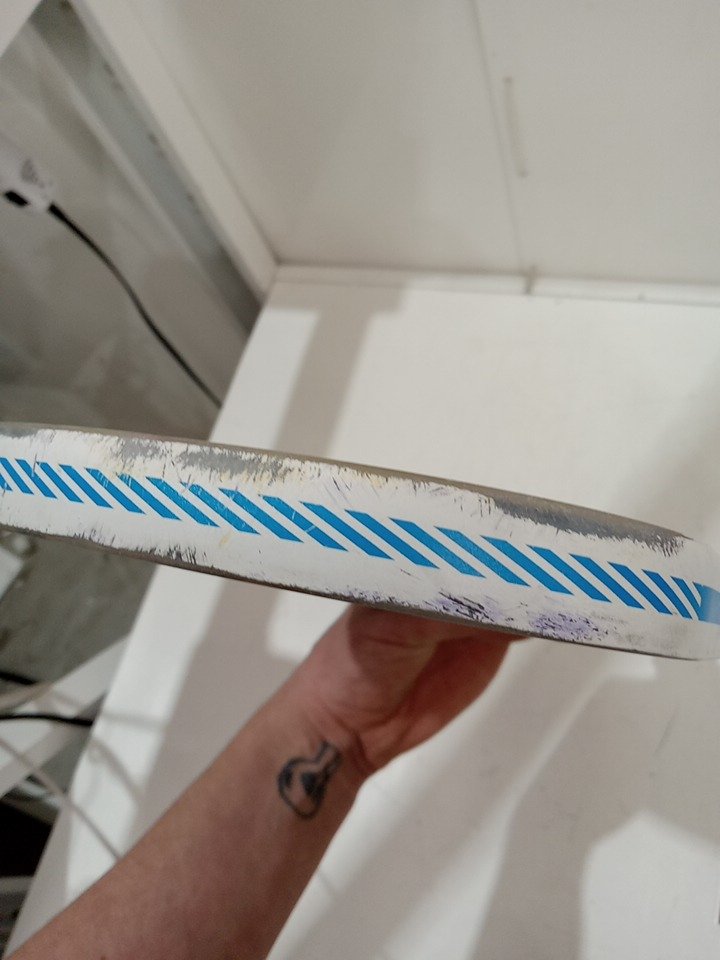 please note that there are scuff marks along the top of the paddle, and some impact marks on the paddle from play the edging is loose around the non-logo side of the paddle please see photos