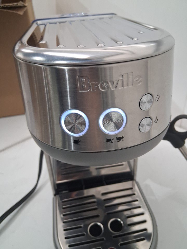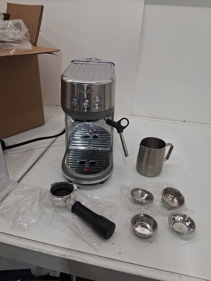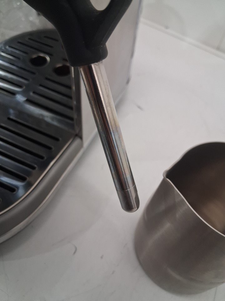Espresso maker has visible discoloration on milk frother, and has visible wipe marks on stainless steel. Has been tested for power