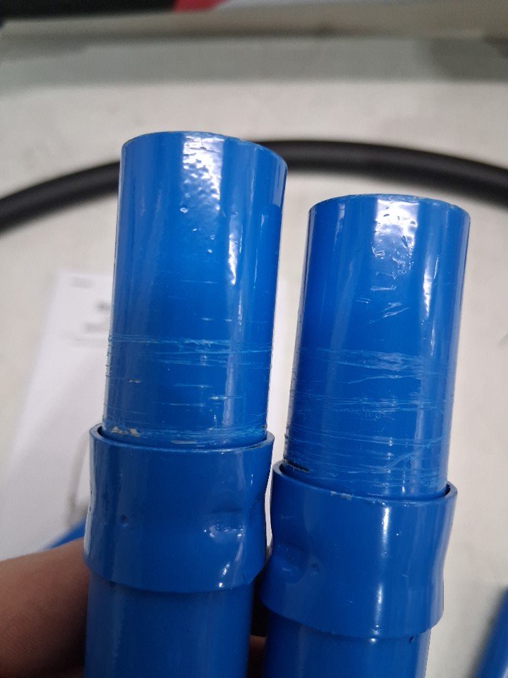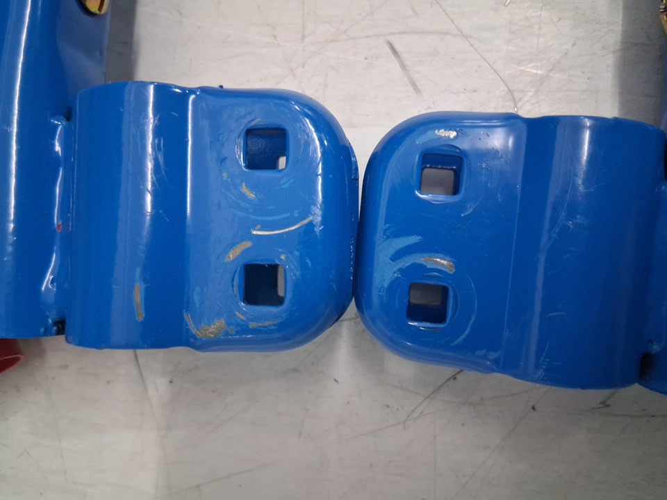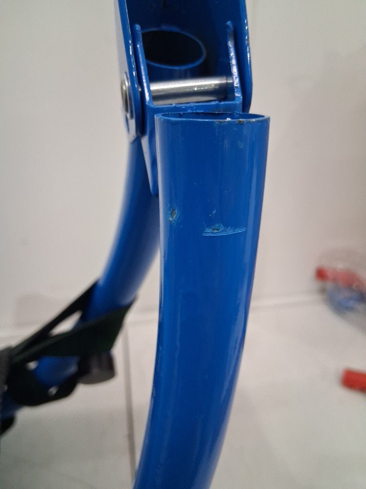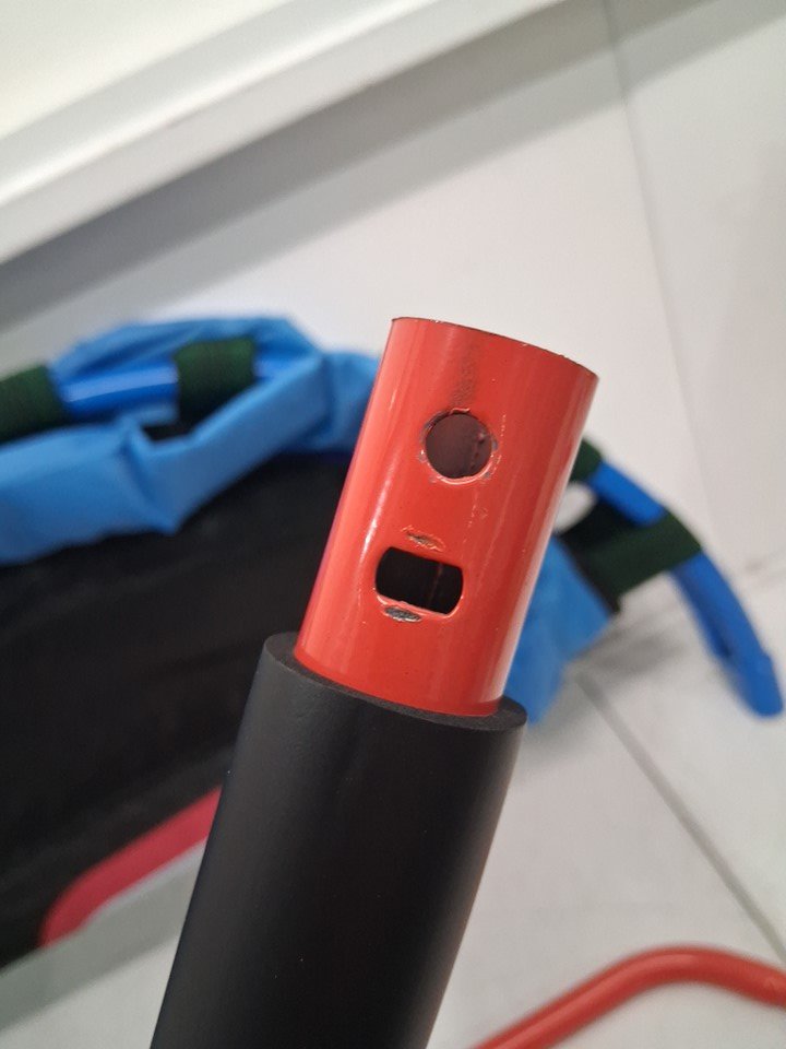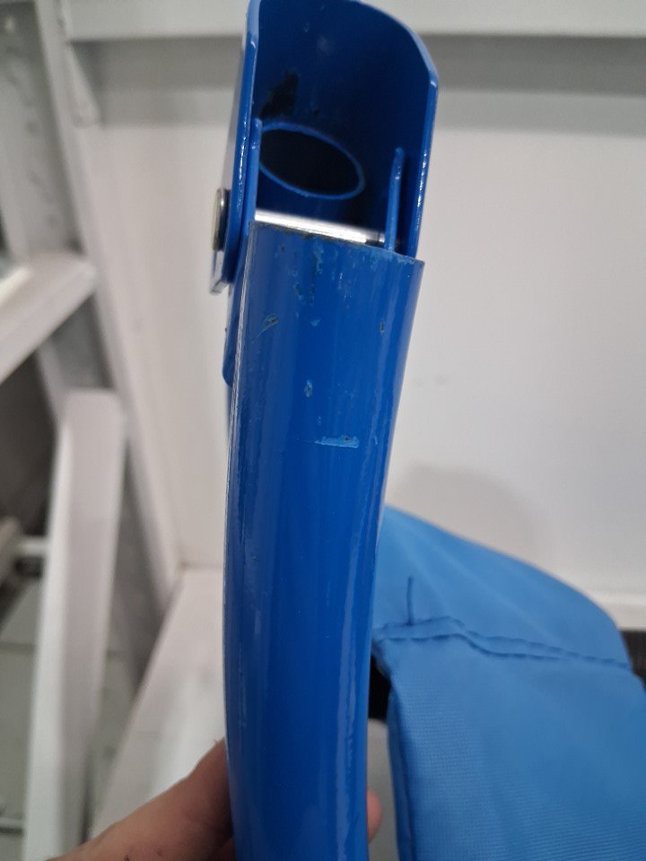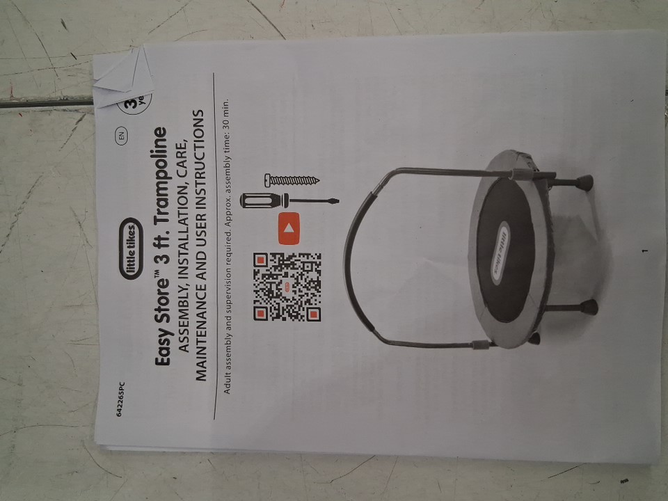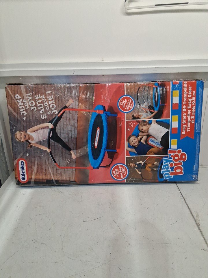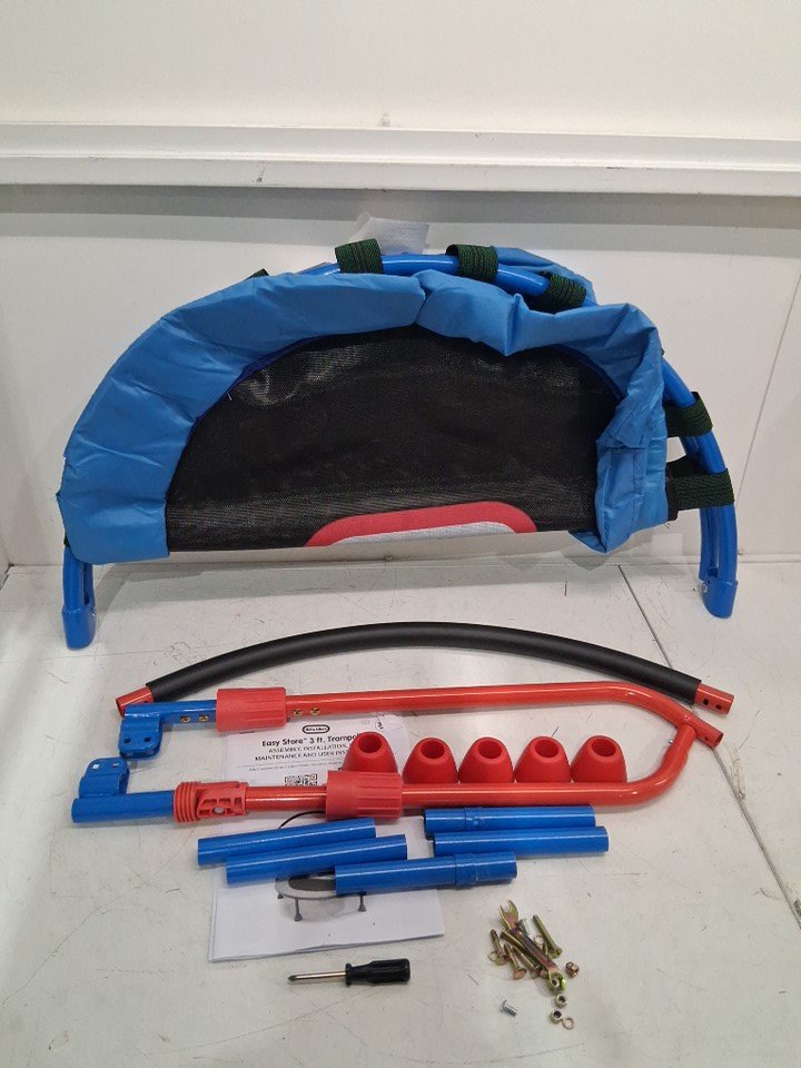 There are scratch marks/paint chips on the ends of most of the poles from being previously assembled, the trampoline looks good.