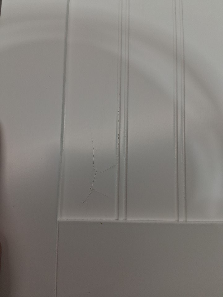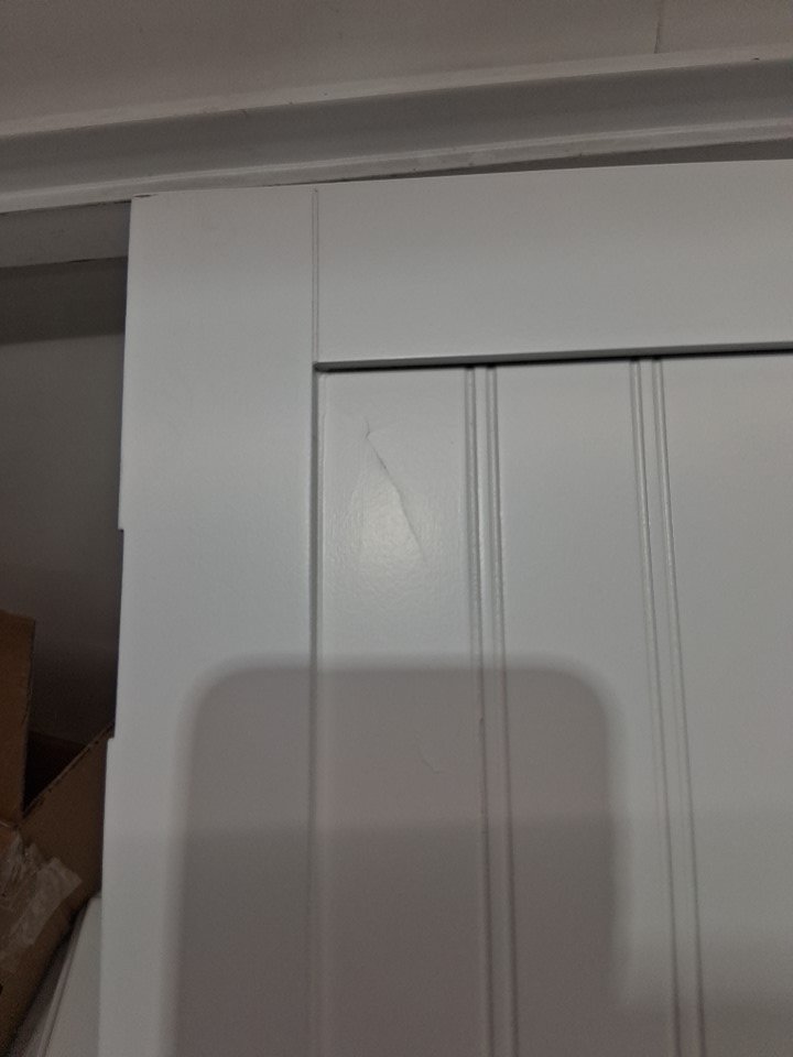 Cabinet door has cracking in the paint, see photos. Some marks on assembly points from being put together