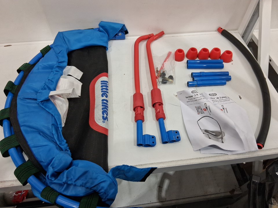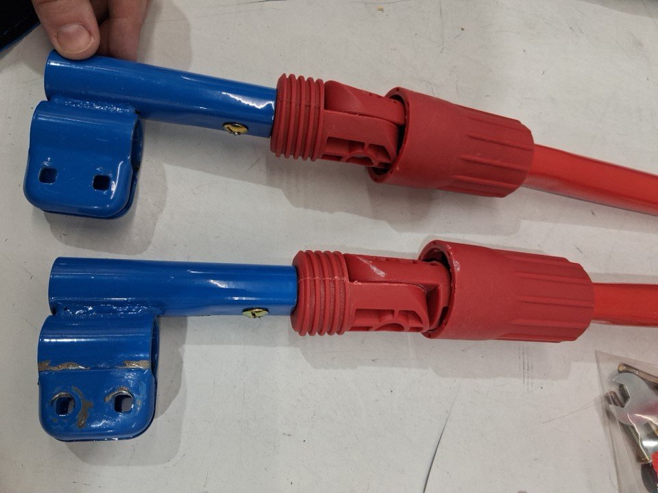 Item shows signs of previous use such as distress from previous assembly on multiple pieces, the foam on the handle is cracked and splitting opened, rubber feet are distressed from dirt/debris, and the rubber is peeling off. Additional hardware may be required for assembly.