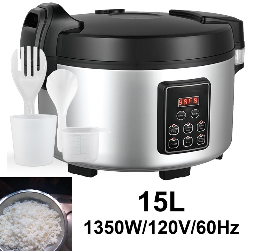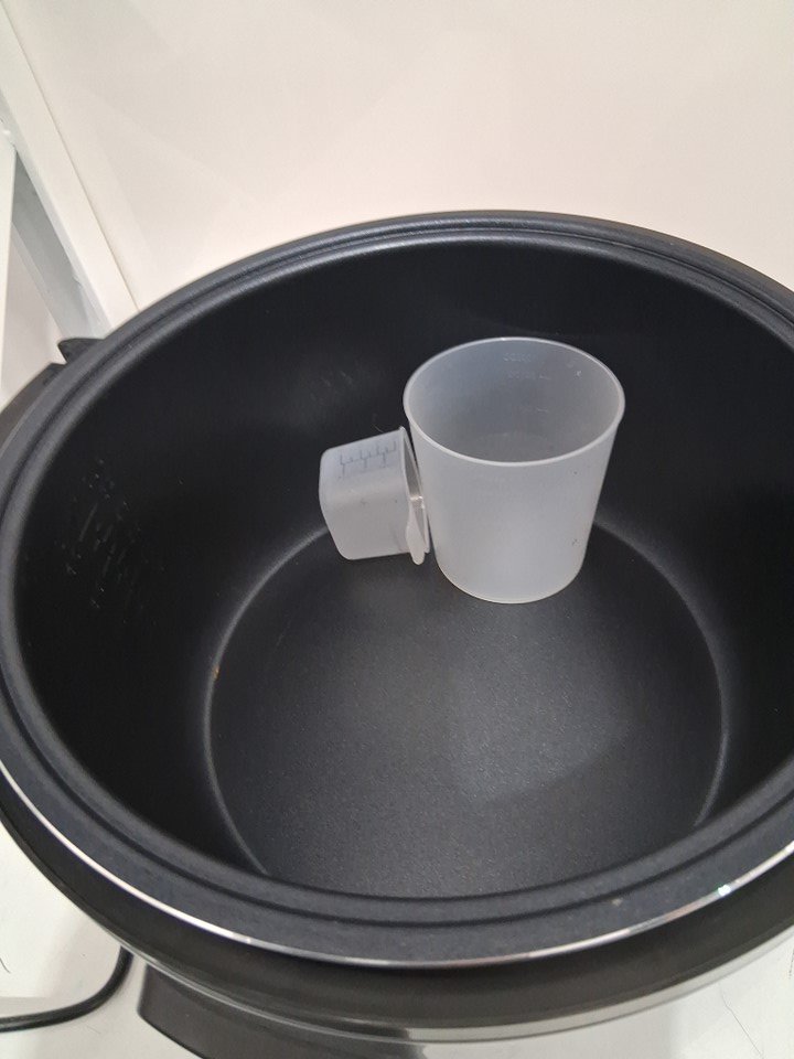 this does not come with the utensils pictured, however does come with the measuring cups. tested for power. please note there is a crack on the plastic of the lid and towards the side. please see photos. does not affect function.