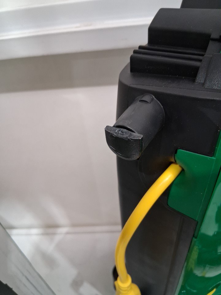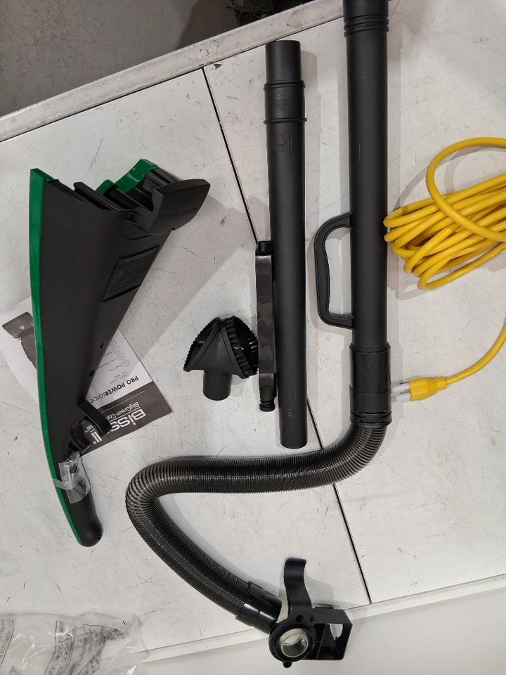 tested for power/function. please note the item has some pet hair/dirt from previous use. the plastic cord holder piece is broken off. see photos.
