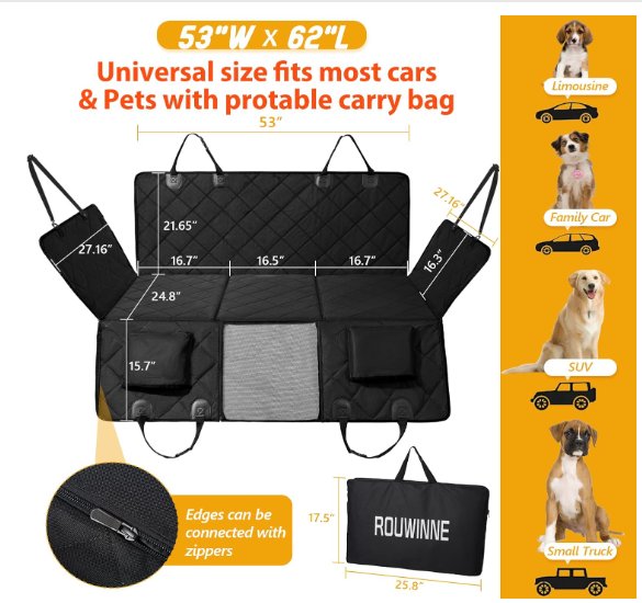 ROUWINNE WATERPROOF BACK SEAT EXTENDER FOR LARGER DOGS - 420LB CAP - 53" X 62" - BLACK