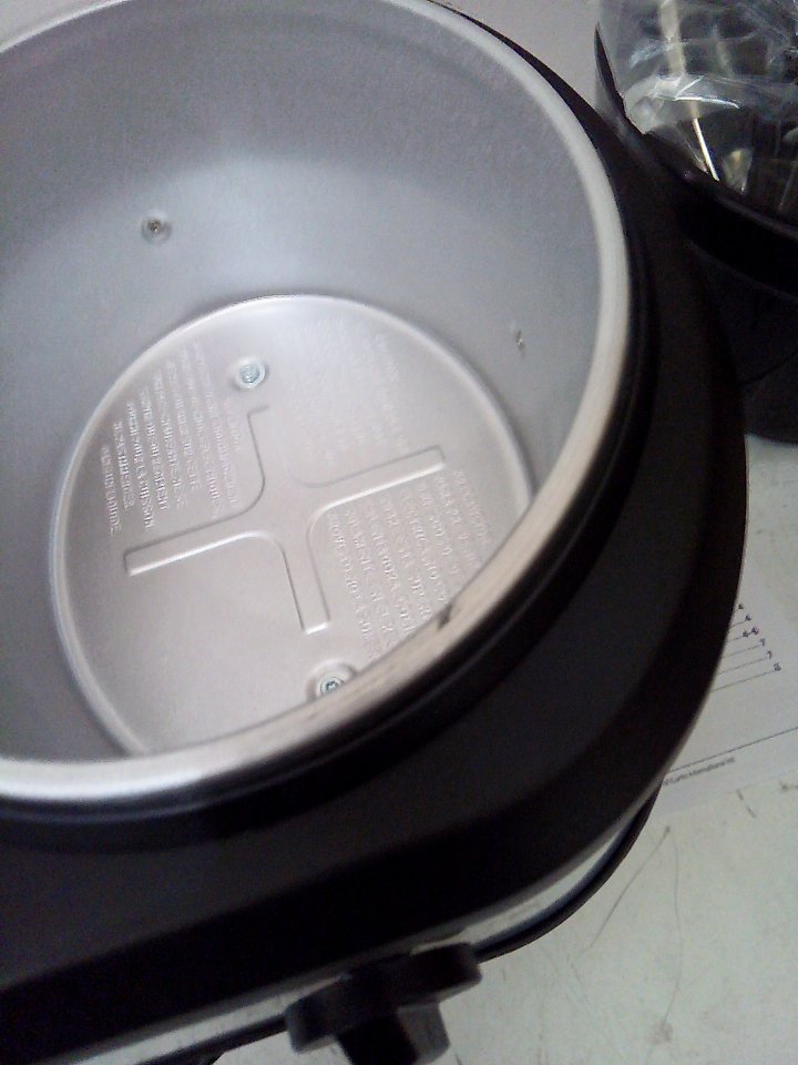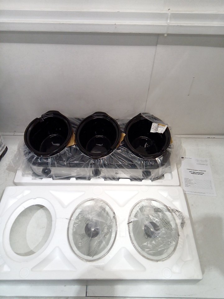 One of the pots is missing a lid and there is a small scratch along the rim of one of the slots that the pots rest in. Tested for power and heat. (SEE PHOTOS)