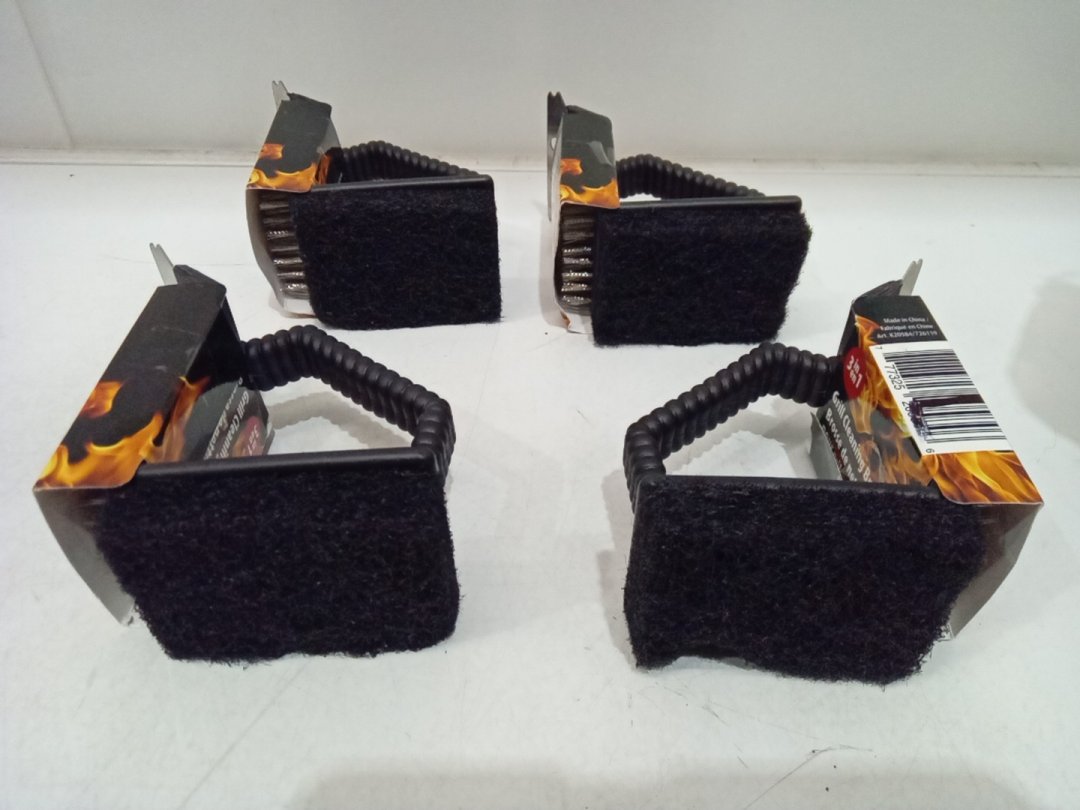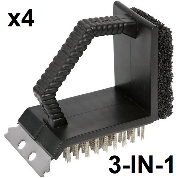 4 3-in-1 Mini Barbecue Grill Brush with Steel Wool, Brush, and Scraper - Black