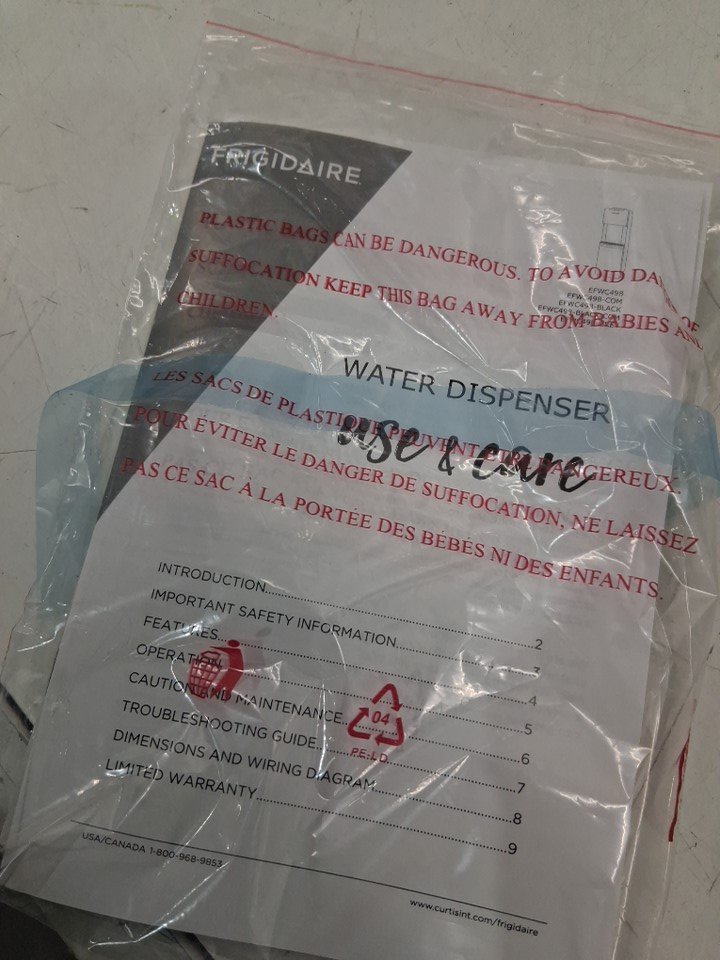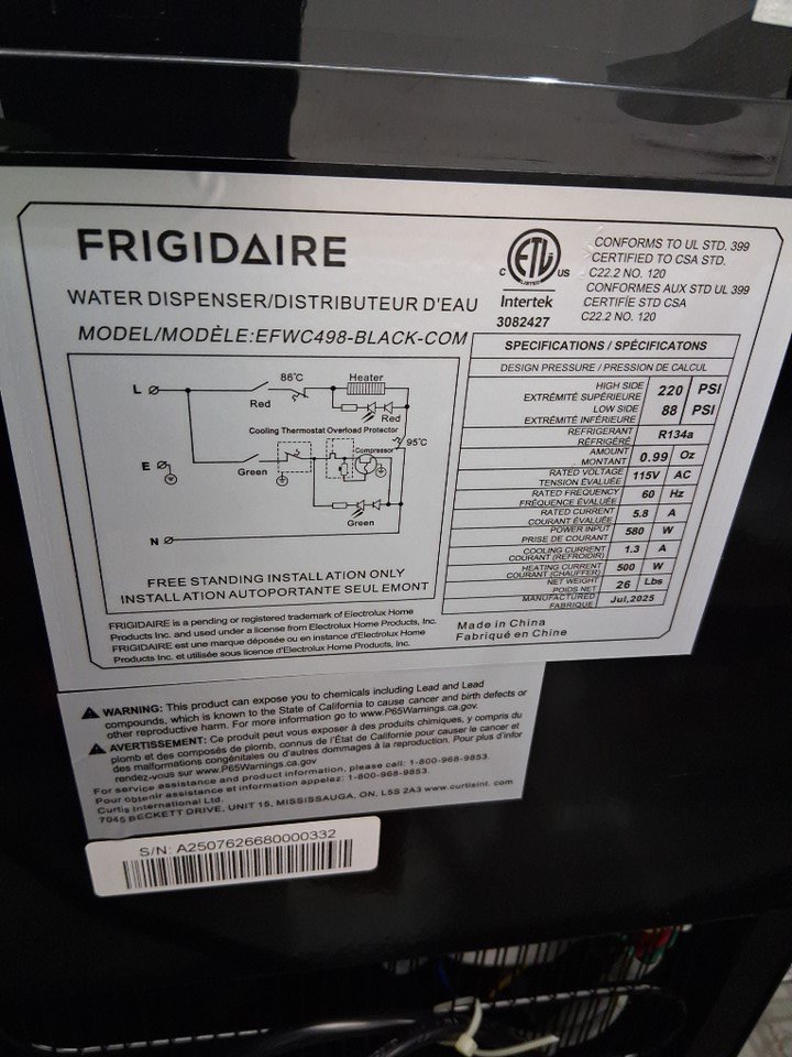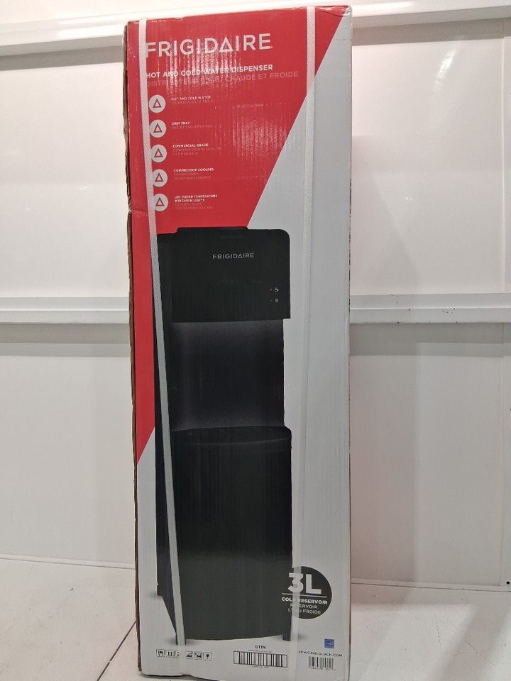 FRIGIDAIRE TOP LOADING HOT AND COLD WATER DISPENSER WITH CHILD SAFETY LOCK HOLDS 3 OR 5 GALLON BOTTLE - 11" x 11.5" x 36" - BLACK - (MODEL: EFWC498-BLACK)