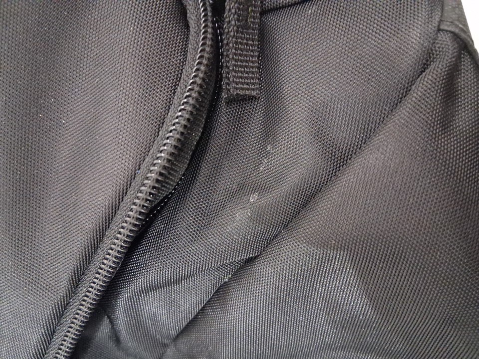 item has small mark on front of bag by zipper pouch as well as some dirt scuffs on the bottom
