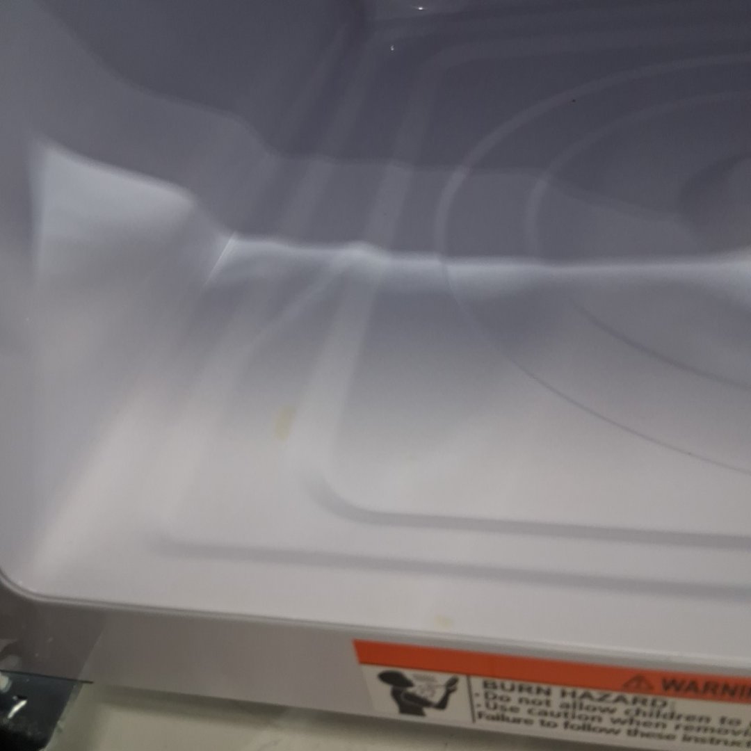 There is a small crip on the bottom front corner. Some food marks on the inside. Tested for power.