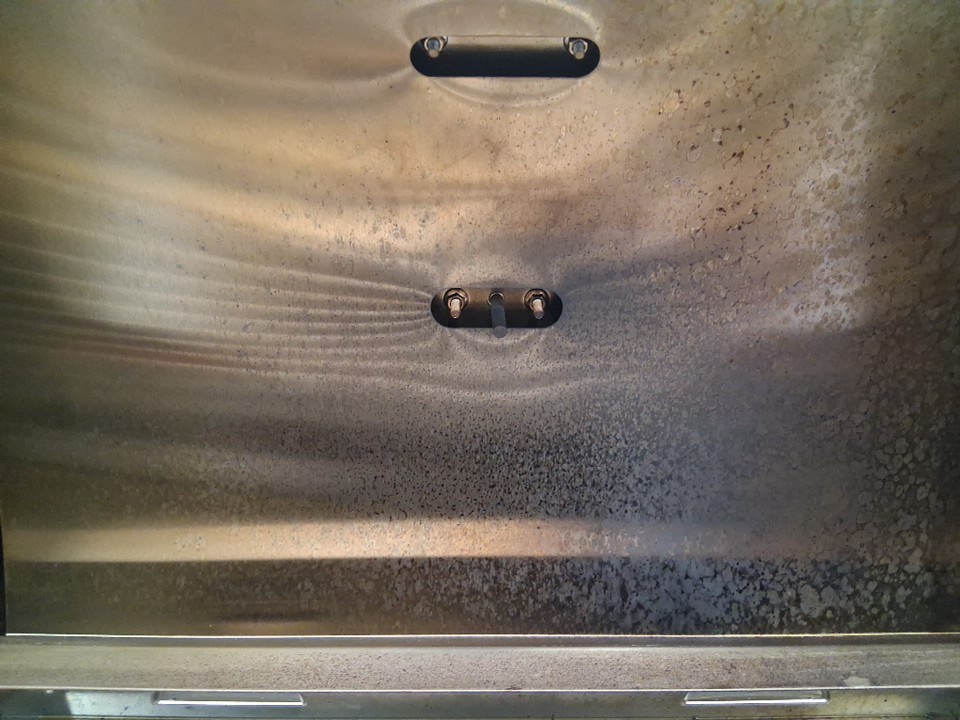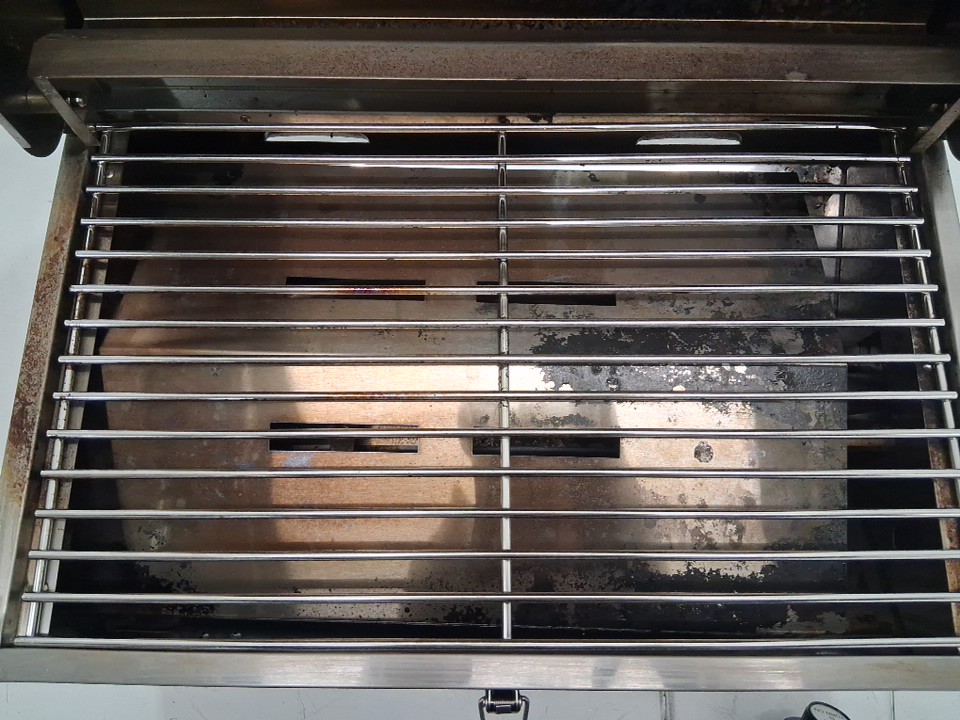 Tabletop grill has visible carbon build up on grill, on lid and on side.