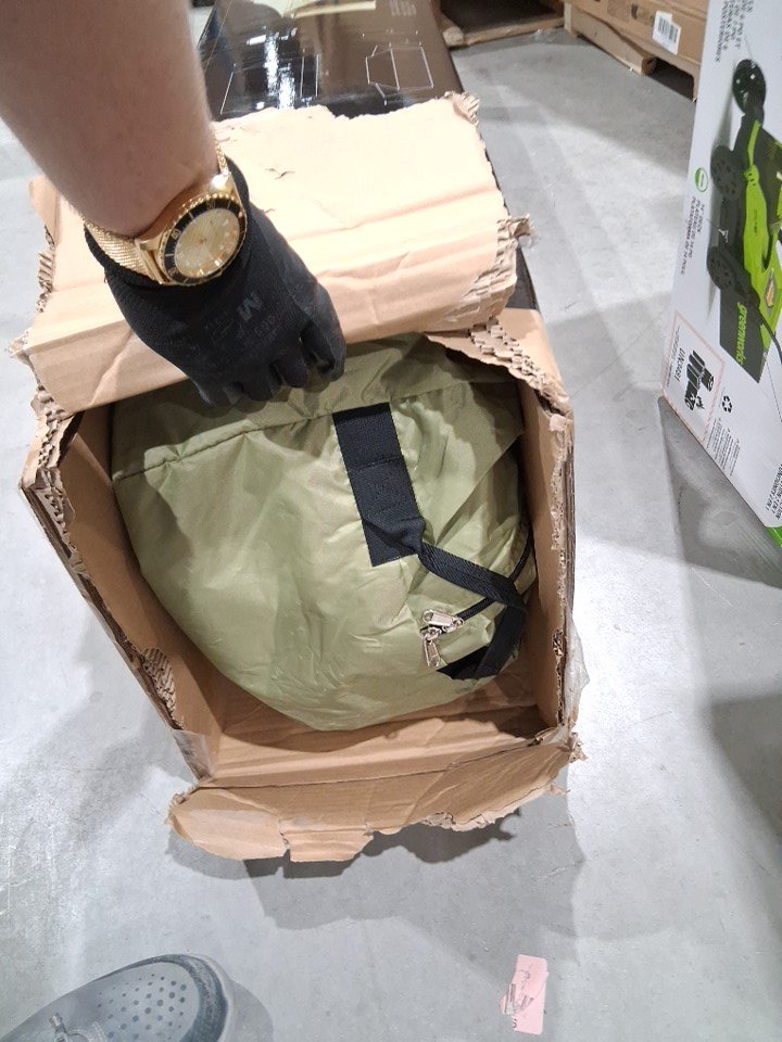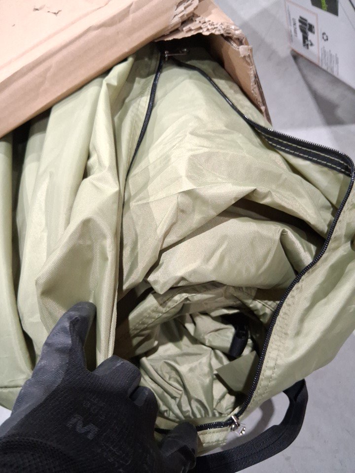 Box was very damaged due to the weight of the inside tent so we fully ripped it open and briefly checked inside