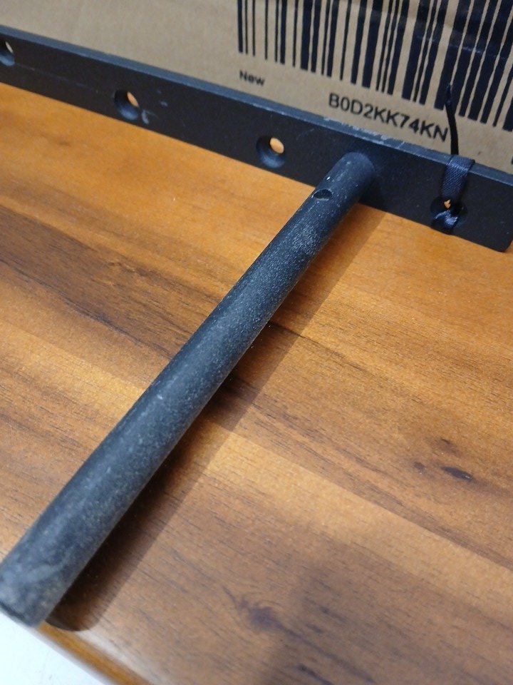 The surface of the wood and the bars is slightly scuffed. One of the brackets sticks a bit when being taken out of the shelf.