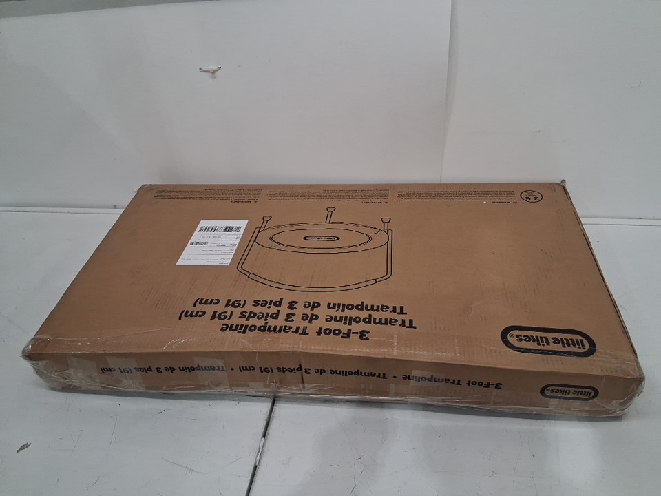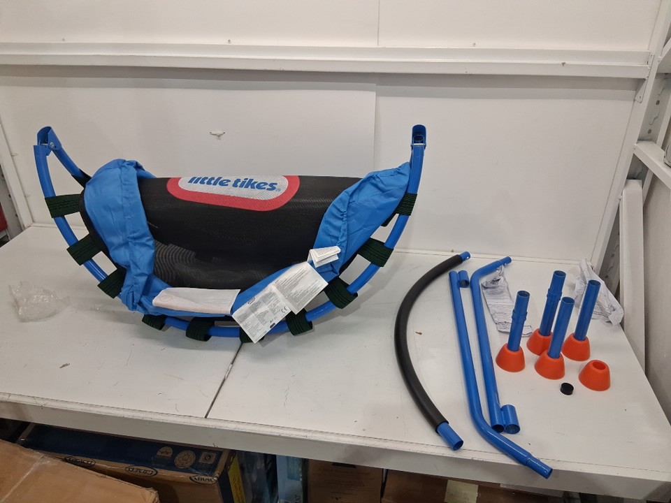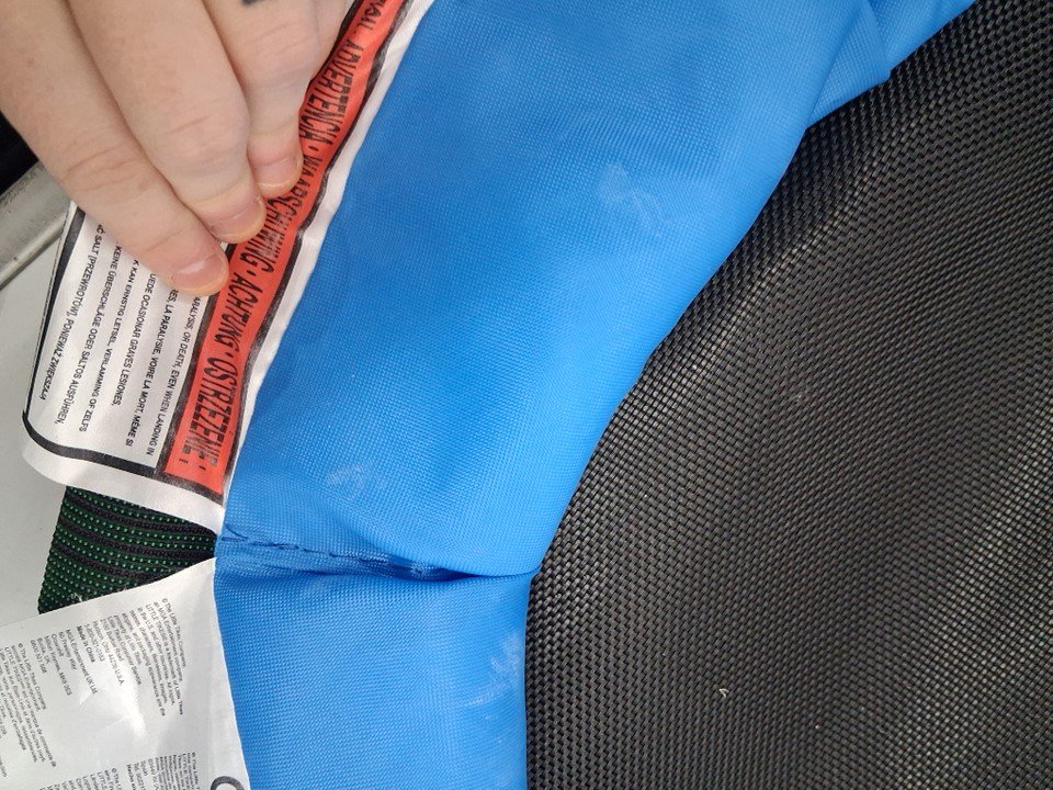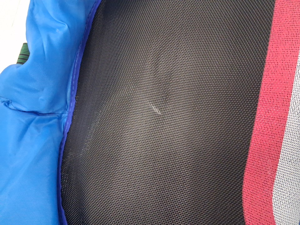 trampoline has small white stains on it, and tool blemishes from previous assembly. One leg and hardware is missing