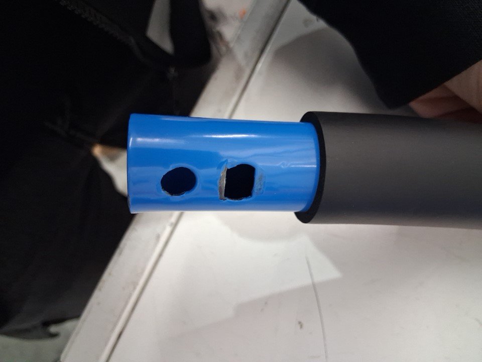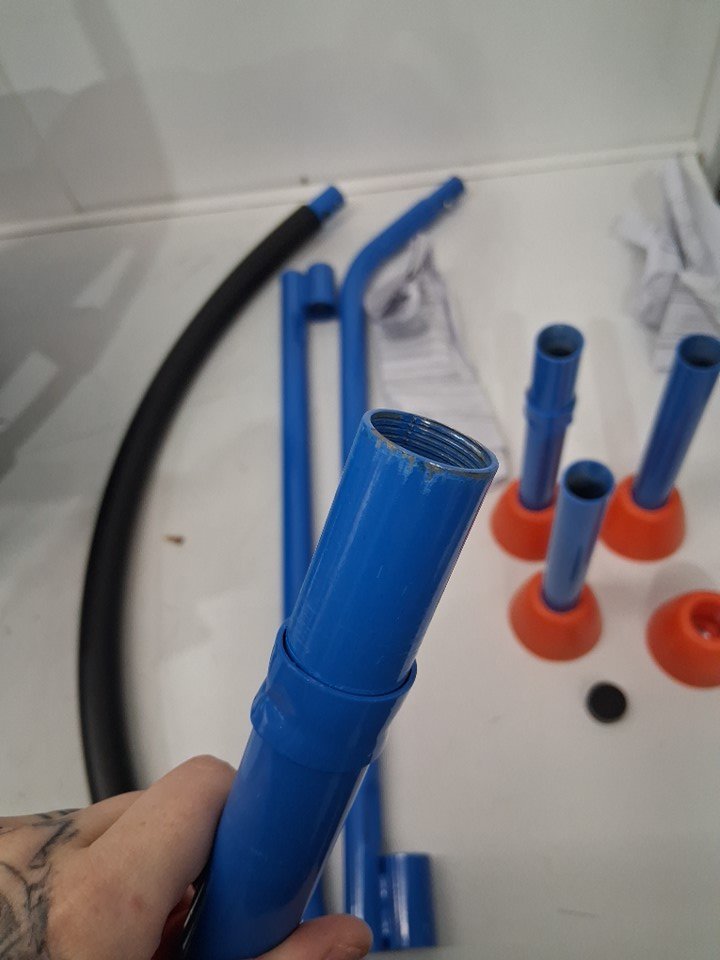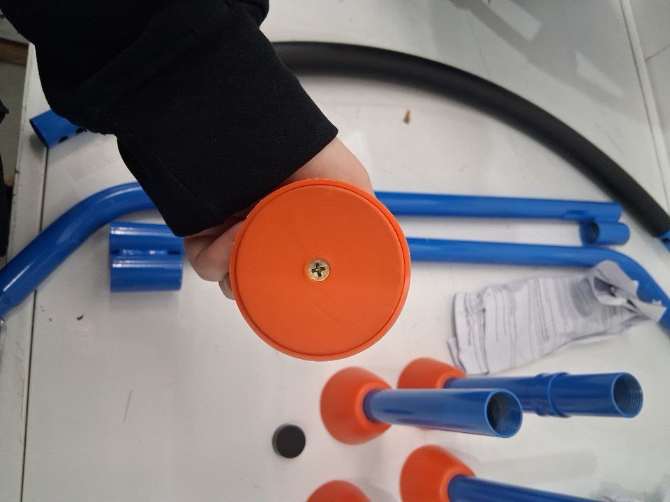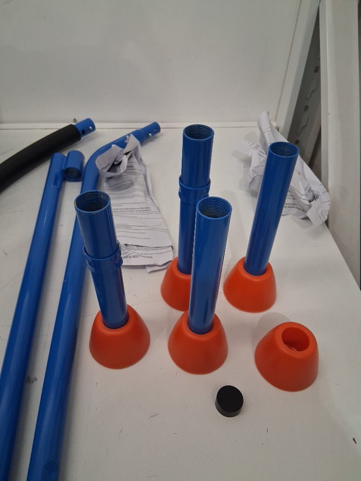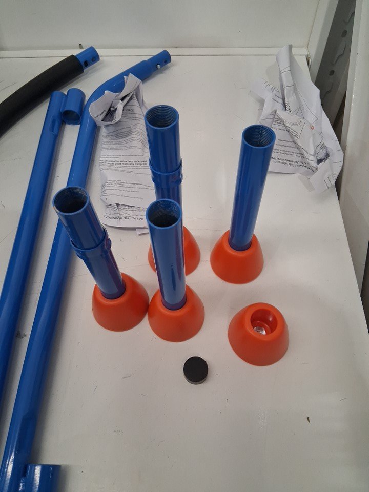 trampoline has small white stains on it, and tool blemishes from previous assembly. One leg and hardware is missing