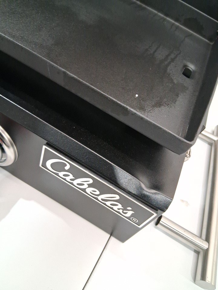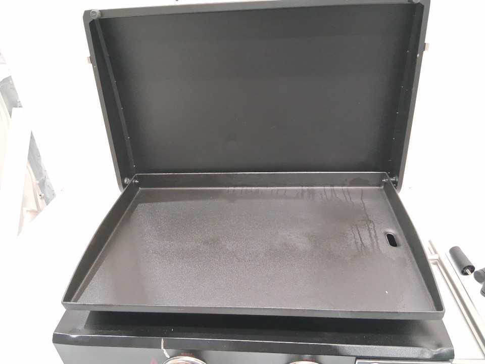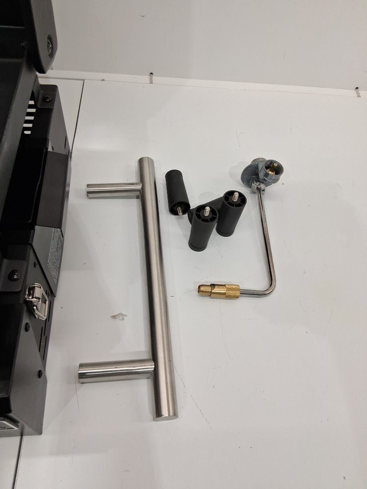 Does not come with a gas hose, as well the frame has a dent on the bottom front left and right and some light paint scraping on the top and edges As well, the handle is not attached but could likely be crazy glued back on Grease and char marks from use