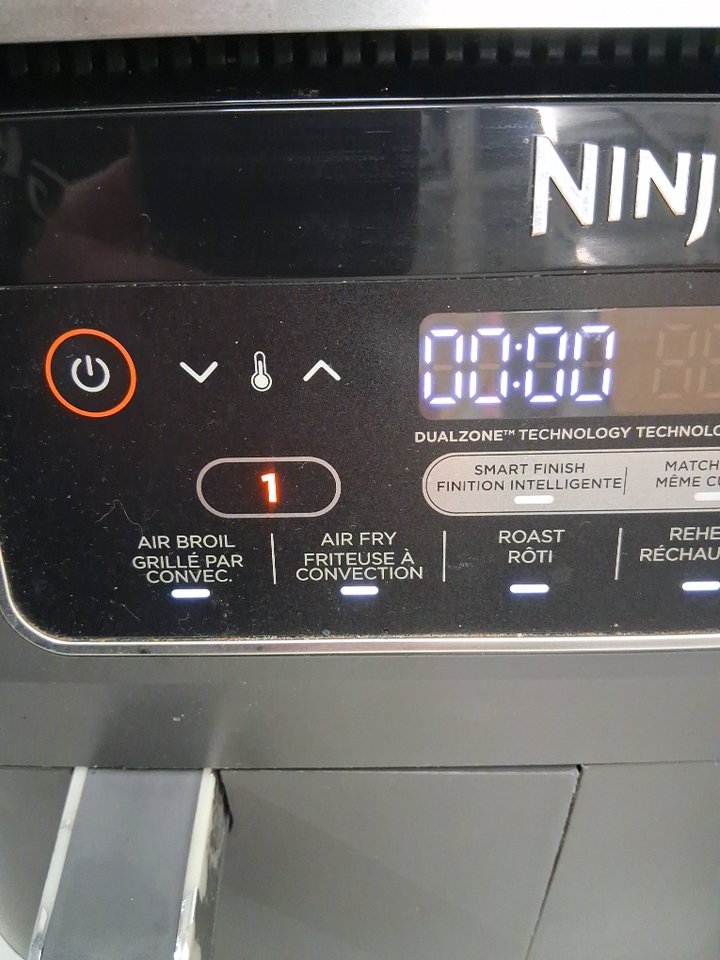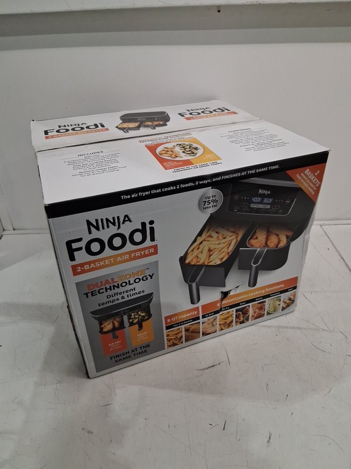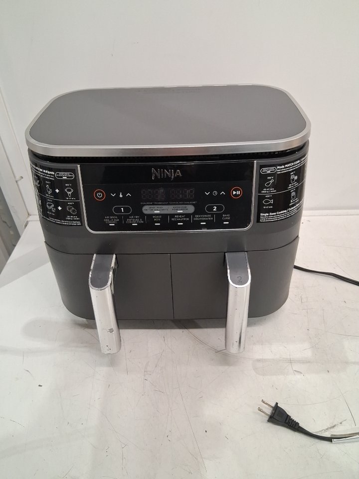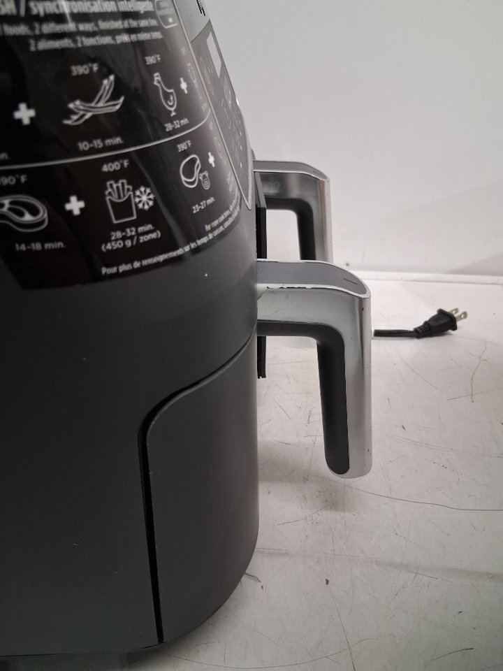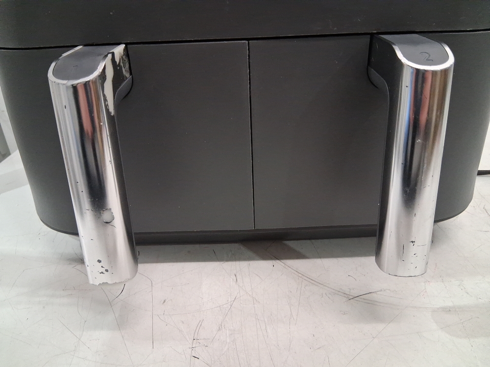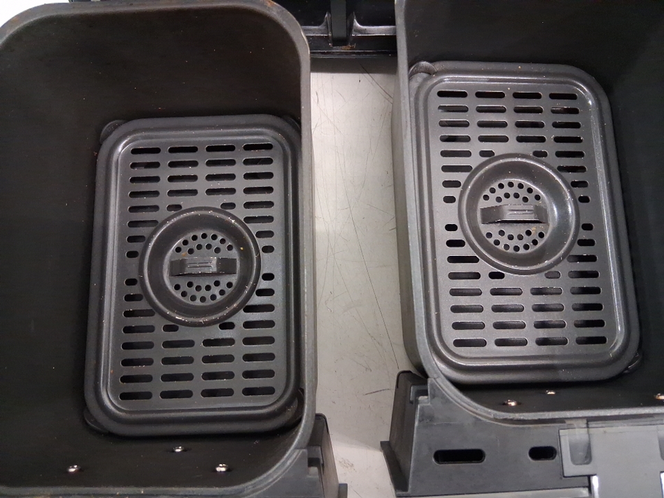 Tested for power. Please note the air fryer shows signs of previous use with food debris/residue in the baskets, scratches/scuffs around the outside, and chips/peeling on the handles, see photos.