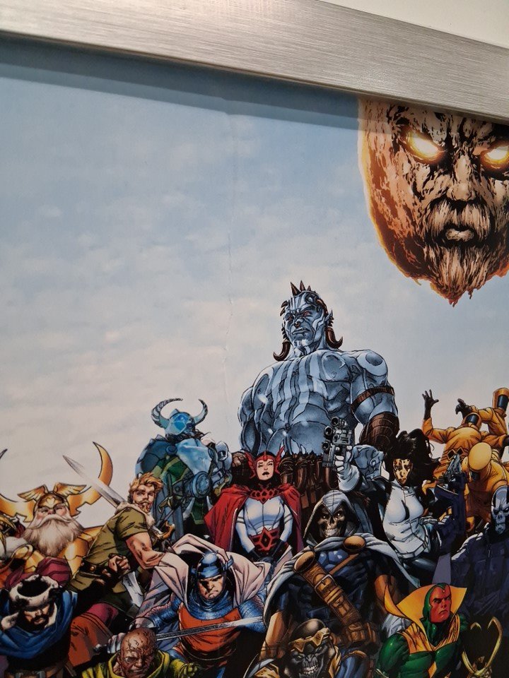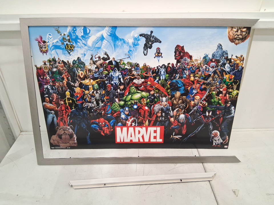 Piece of frame has broken off, reattached by tape; poster has small bend in Right Corner. (See photos)