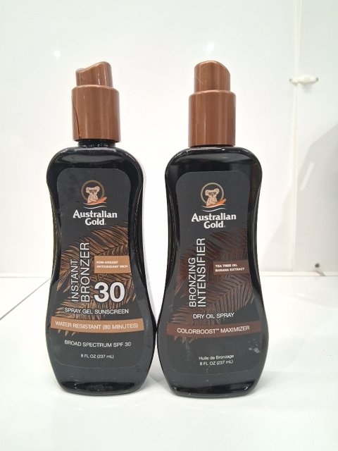 2PC AUSTRALIAN GOLD INSTANT BRONZER SPRAY GEL SUNSCREEN - SPF 30 AND BRONZING INTENSIFIER - 237ML