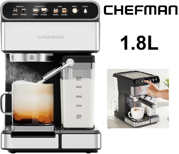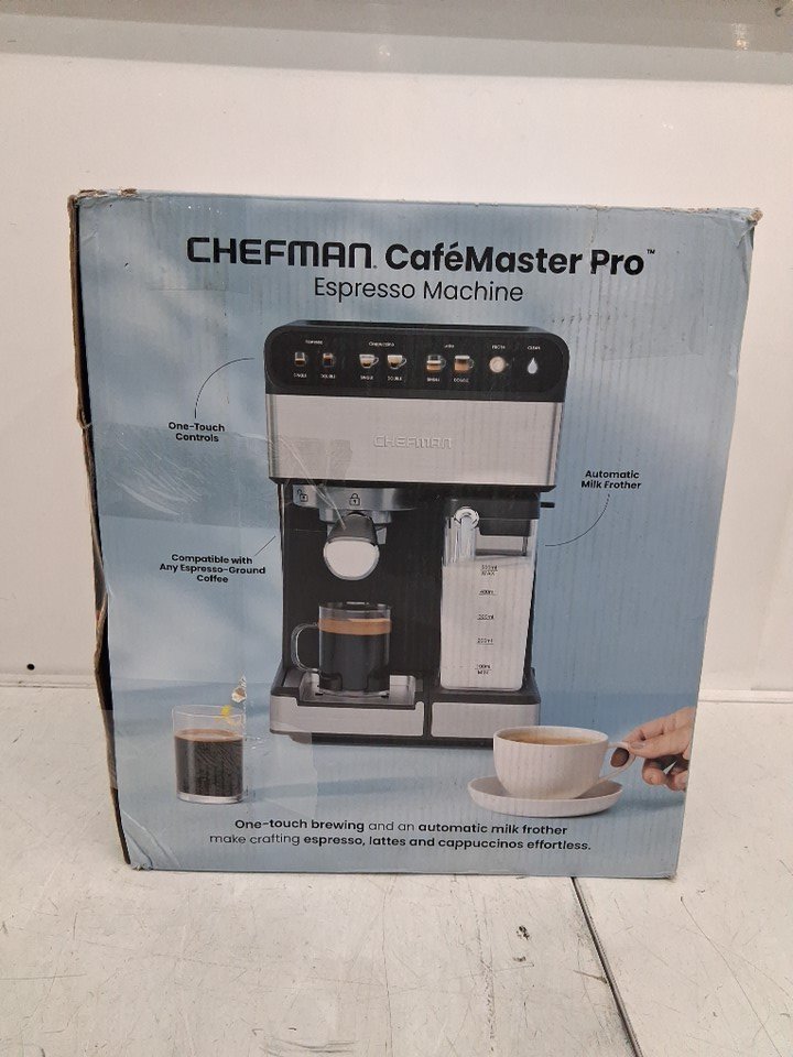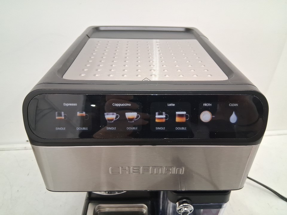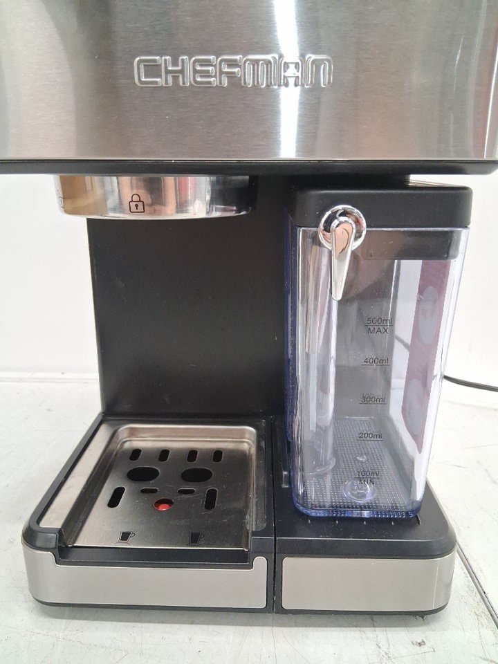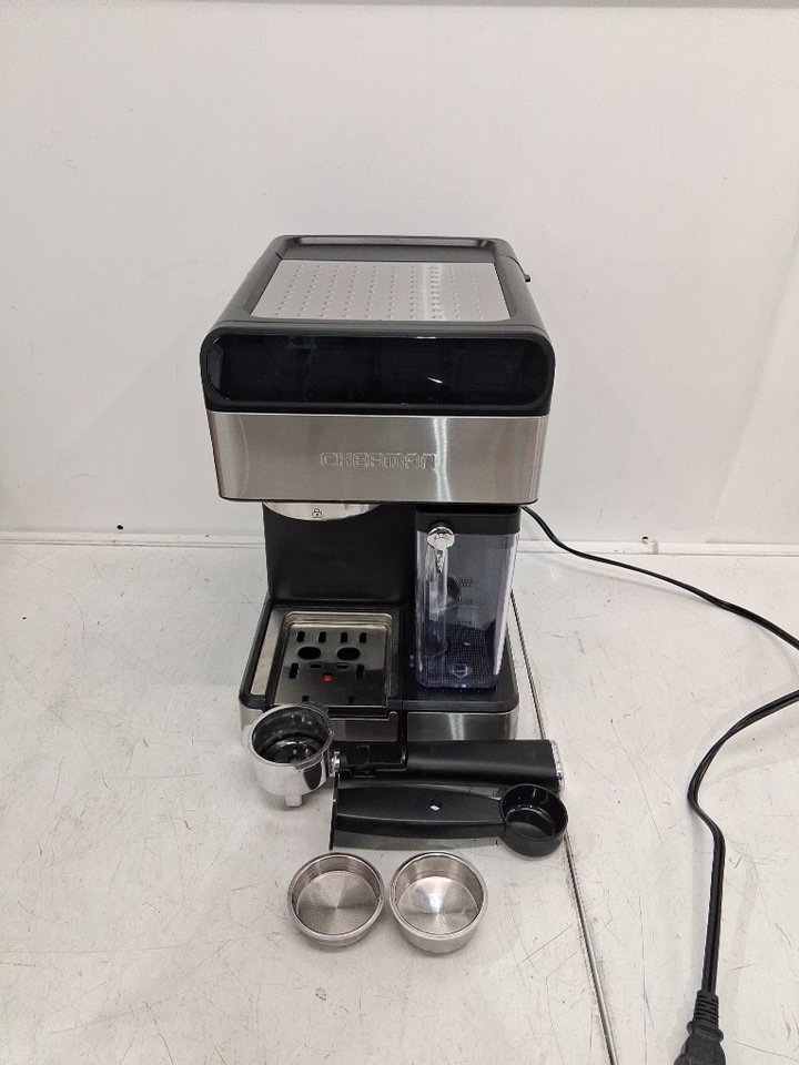 ITEM HAS BEEN TESTED FOR POWER, HAS SIGNS OF LIGHT USE. water reservoir has a giant crack in it, can be replaced from link provided. see photos https://www.shopjimmy.com/chefman-rj54v2-espresso-maker-replacement-reservoir-with-lid/?srsltid=AfmBOooyiUMjHhwEK1mcfc7cPs0k1FDHOlHjzx5TxfP1ldD30VR6tMl1