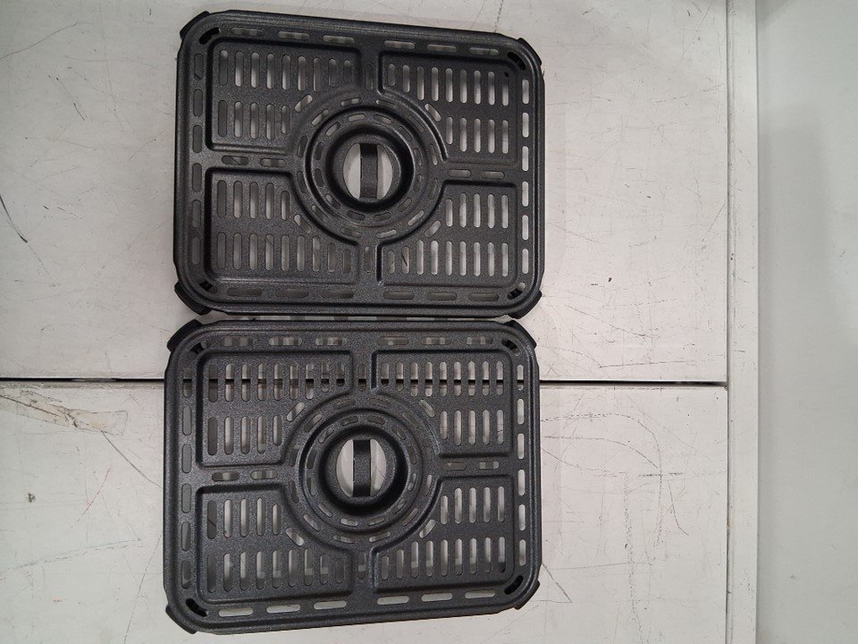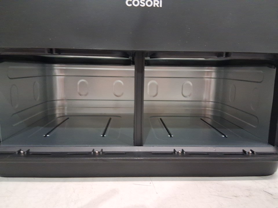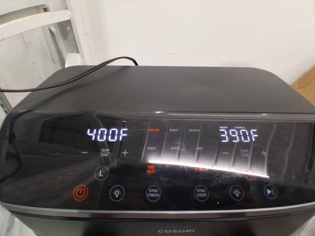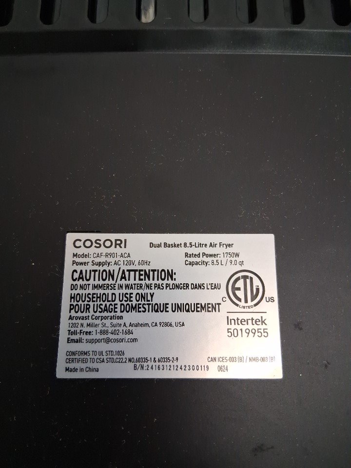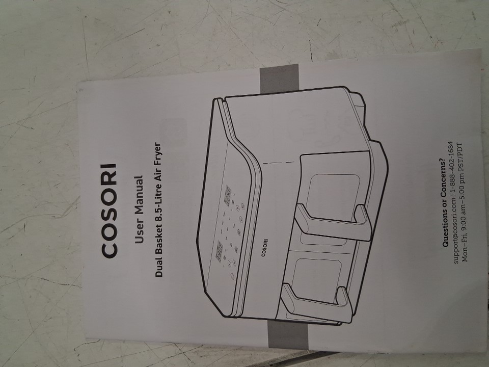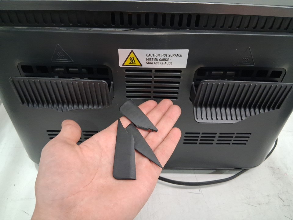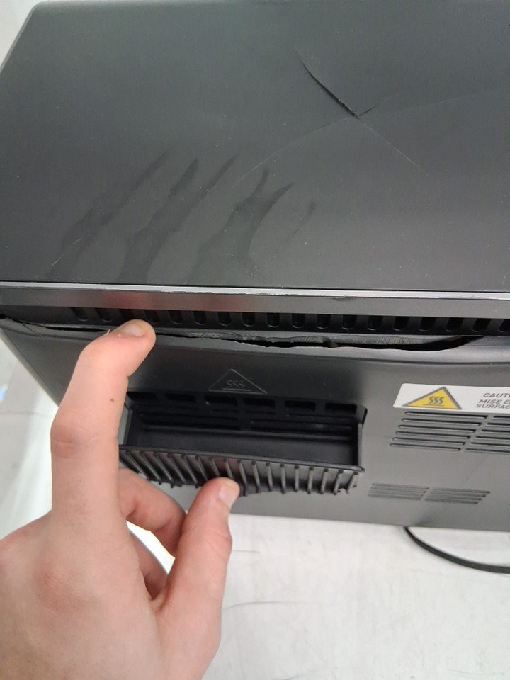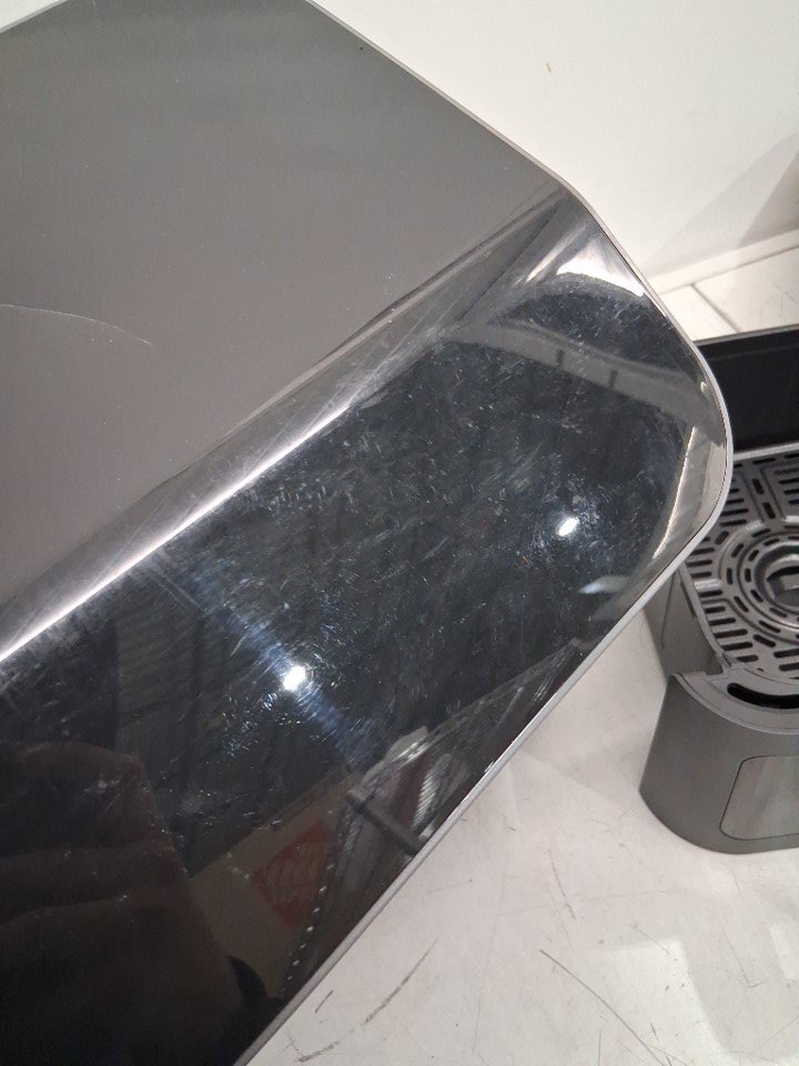 There is a crack on top of the air fryer, the two plastic pieces on the back have been broken and there is also a crack at the back of the air fryer. There are also some smudge marks on the touchscreen. The air fryer does not look like it has been used before. Tested for basic power.