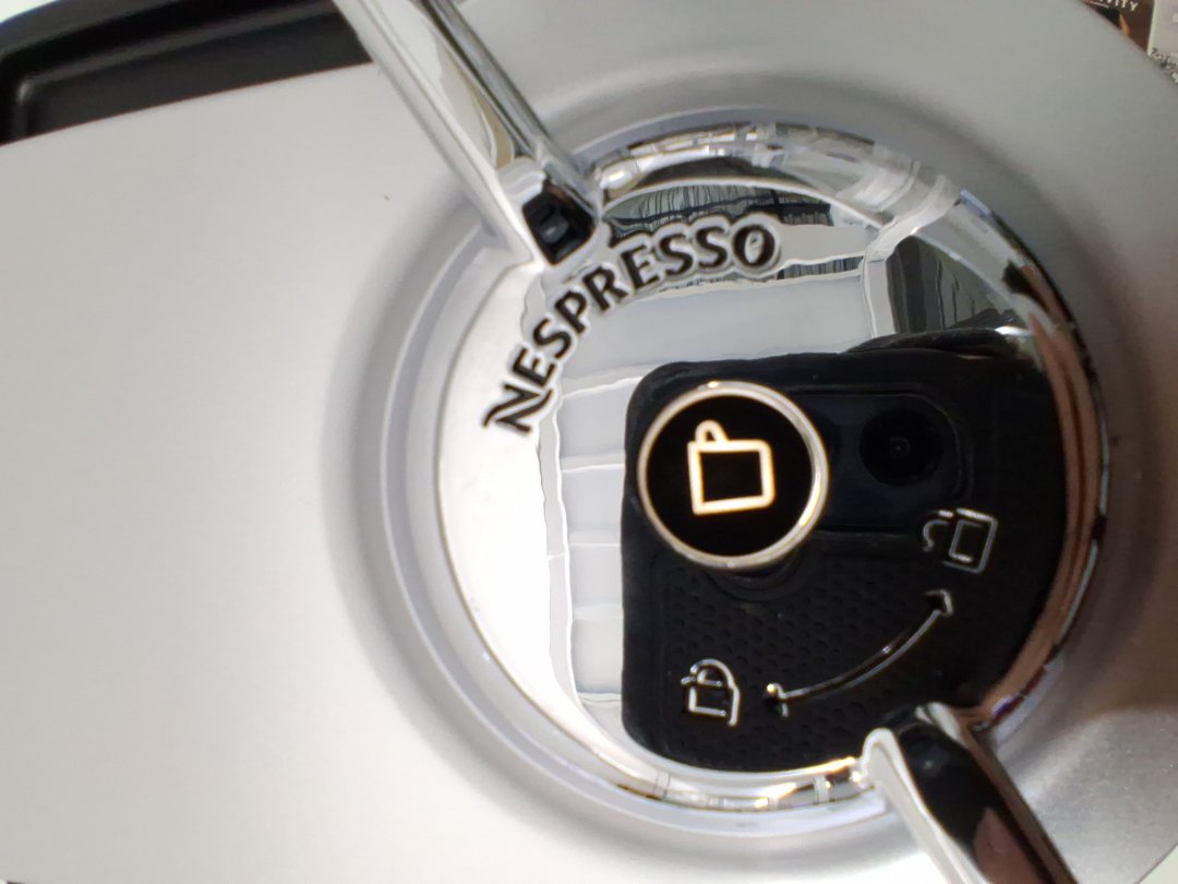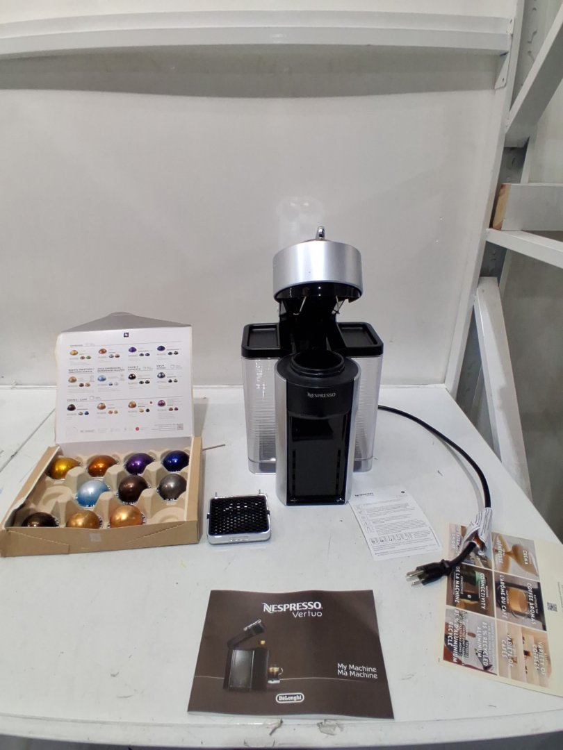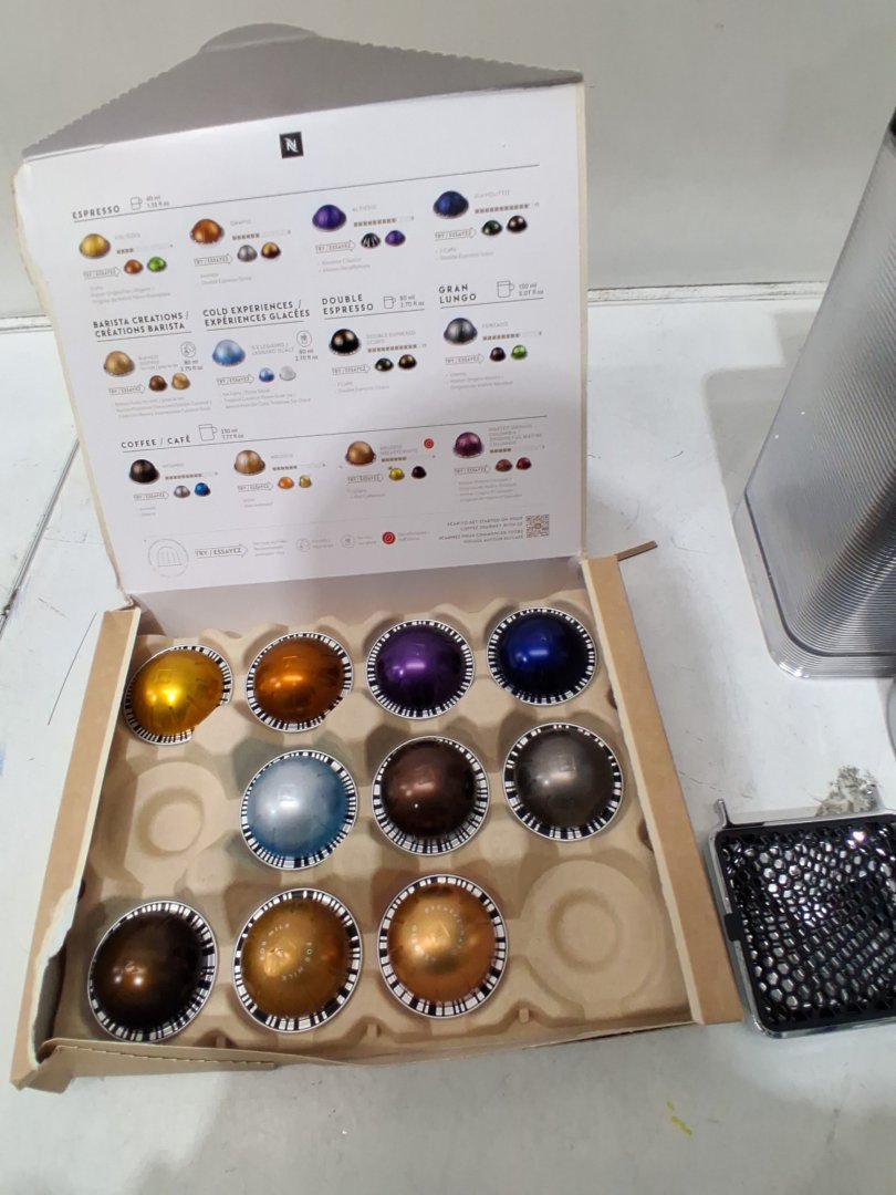 Unit has coffee grounds and missing capsules suggesting prior use. Tested for power.