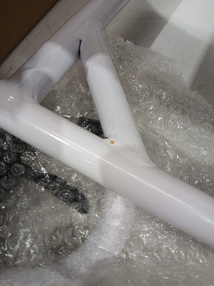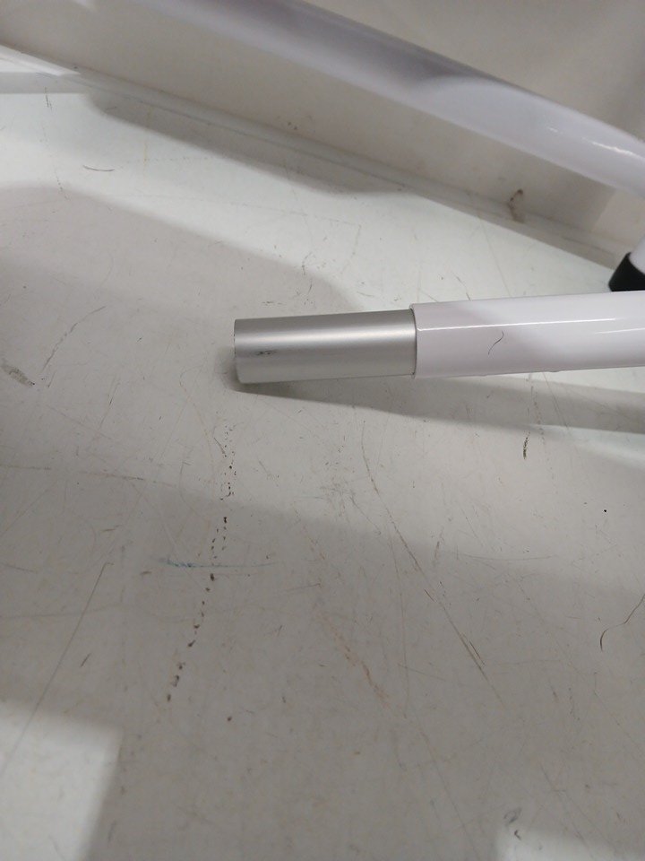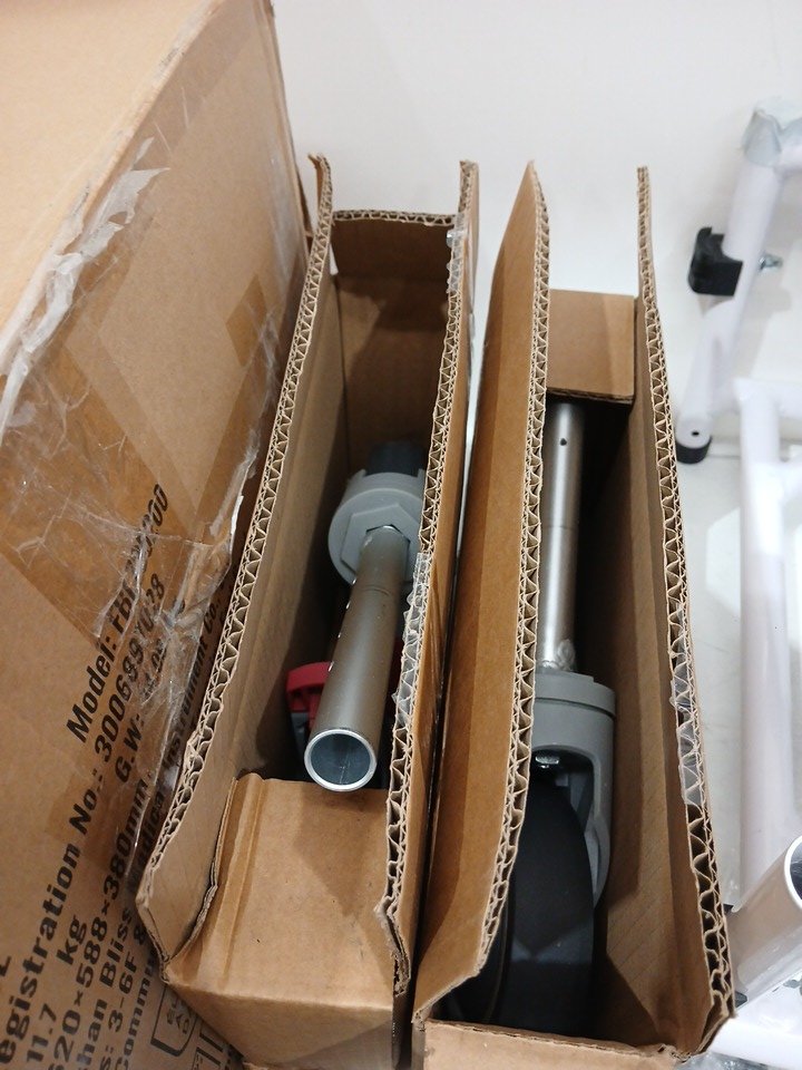 The wheels show wear and there is some dust/markings on the poles from use. Seat was wiped down by staff.
