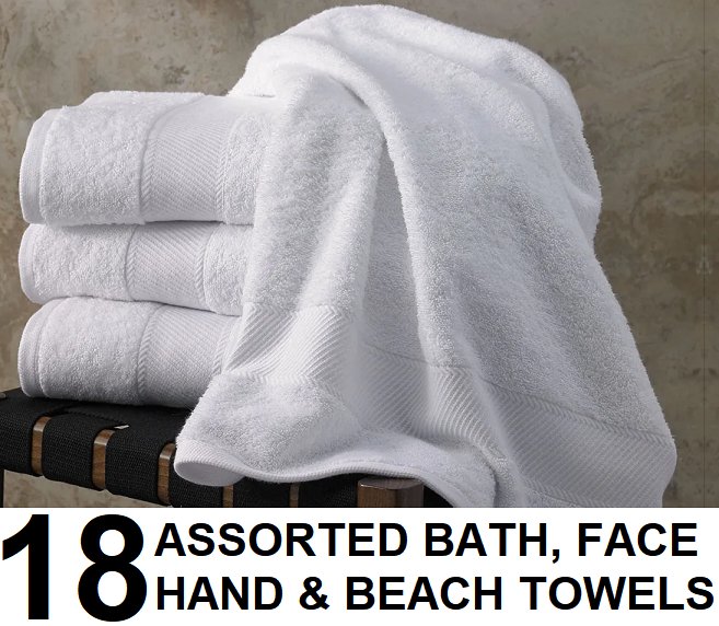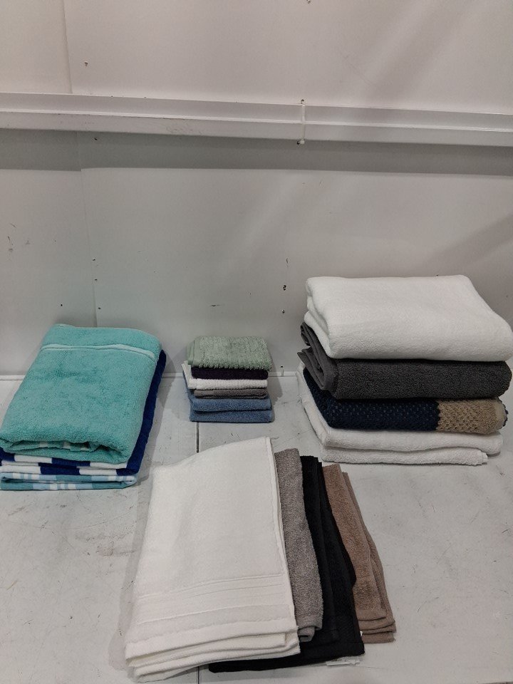 18 assorted bathroom and beach towels - body towels, hand towels, face cloths and outdoor towels - assorted colours/patterns